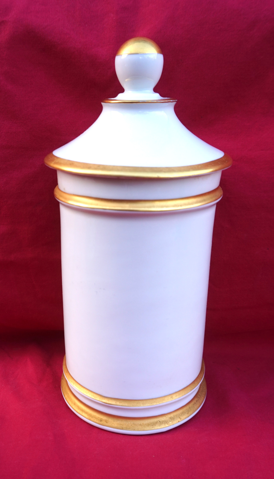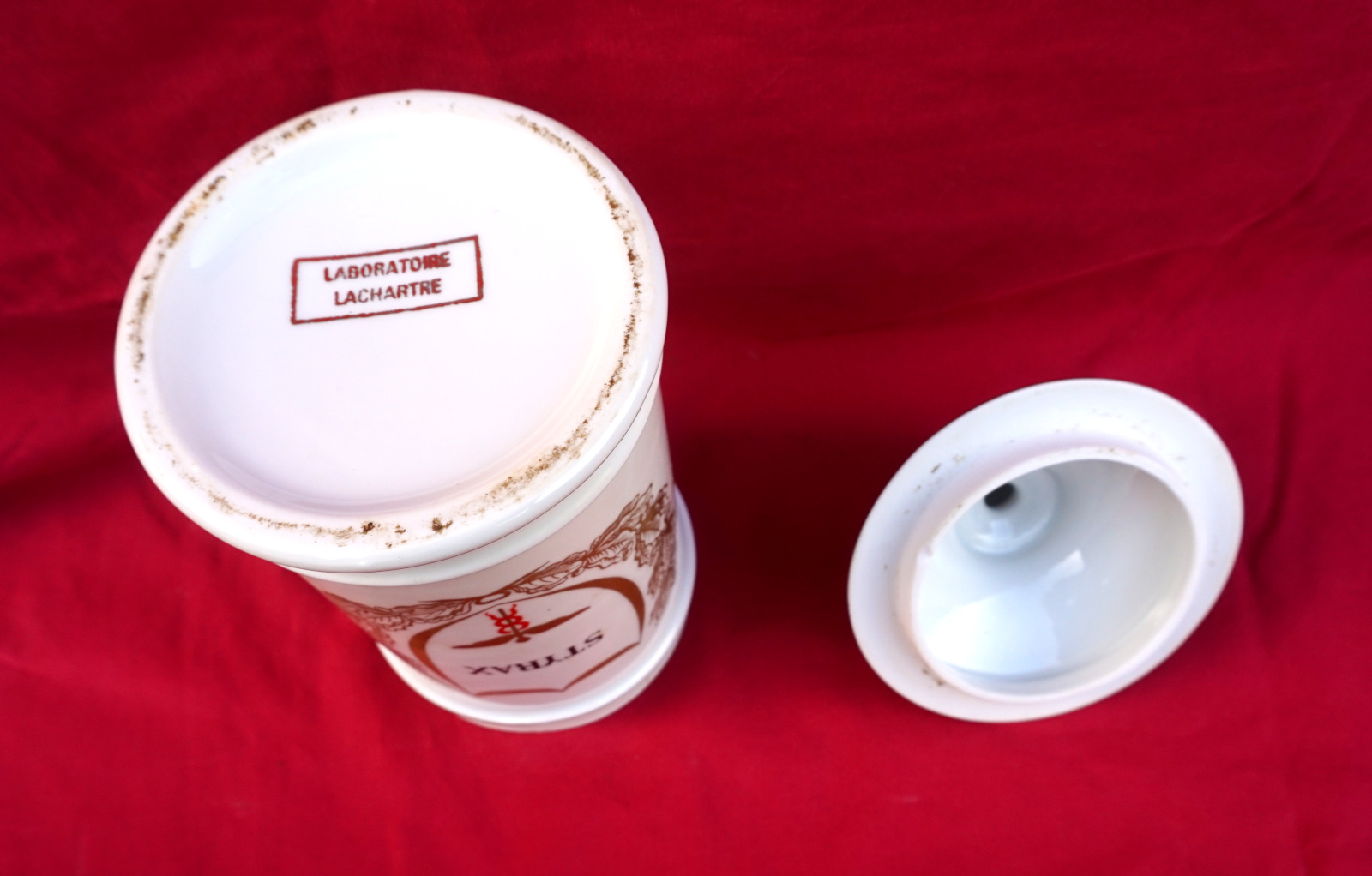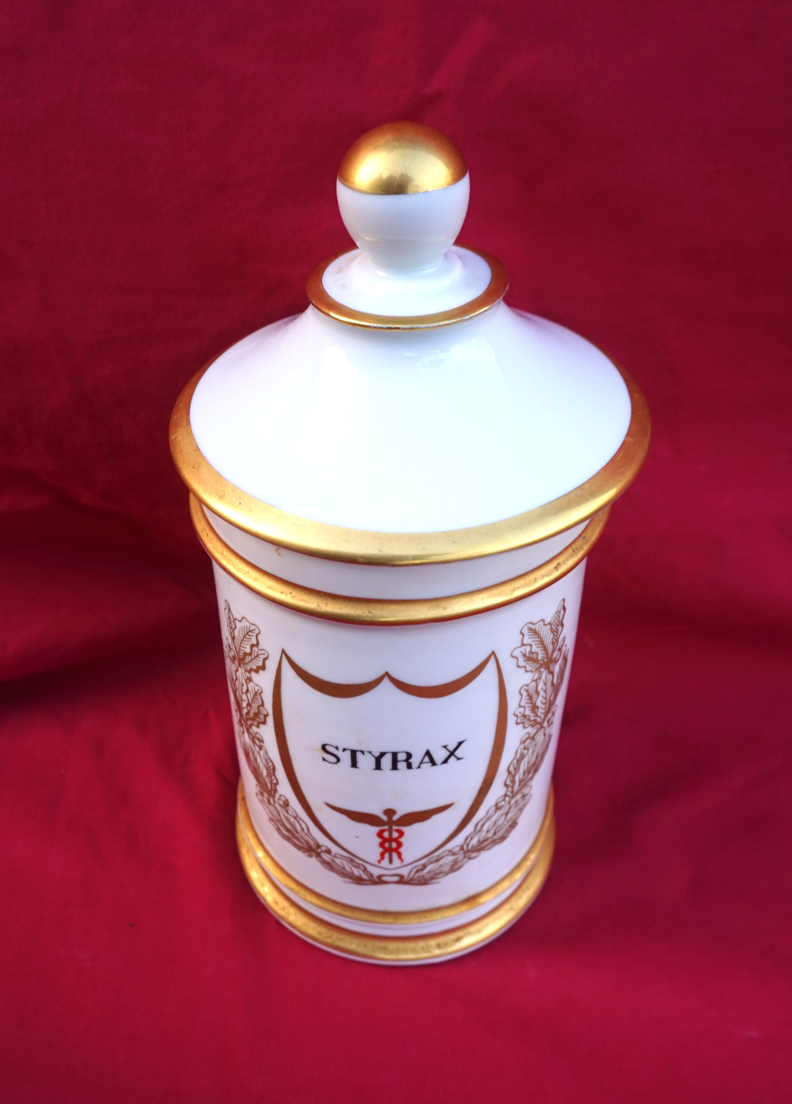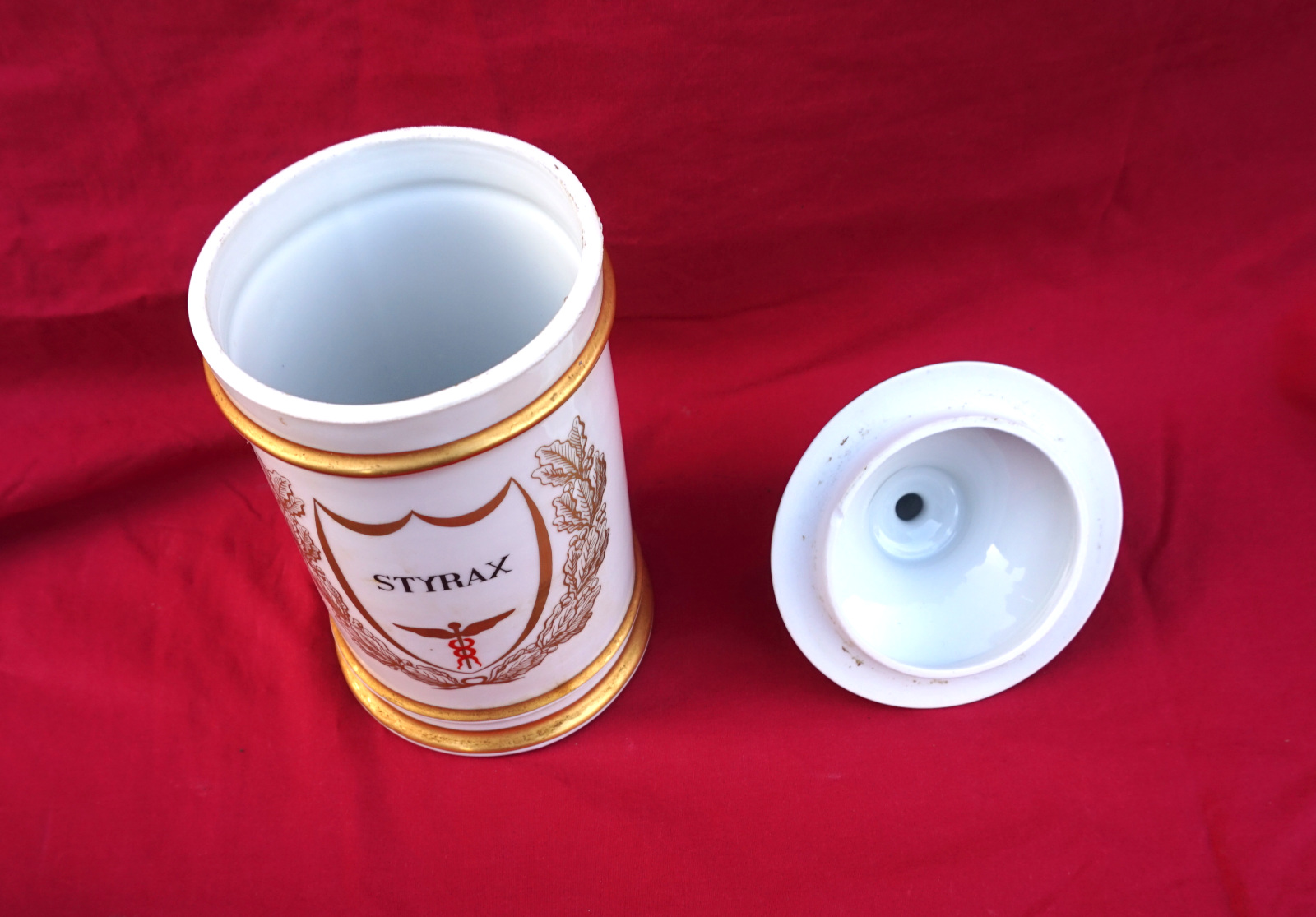For our French-speaking friends Pot à pharmacie pour Styrax en porcelaine de Limoges réhaussé de décor or et transfert, vers 1950. Hauteur totale 20 cm, diamètre 11 cm. Parfait état.