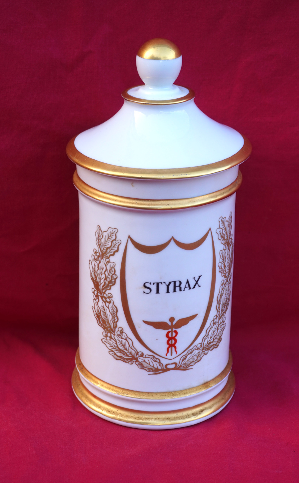French gilt and transfer porcelain apothecary jar for STYRAX made in Limoges. 8 5/8" (22cm) total height, 4 1/4" (11cm) diameter. Perfect condition