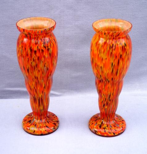 Czech Art Glass Orange Splatters Pair Vases 8 1/2"