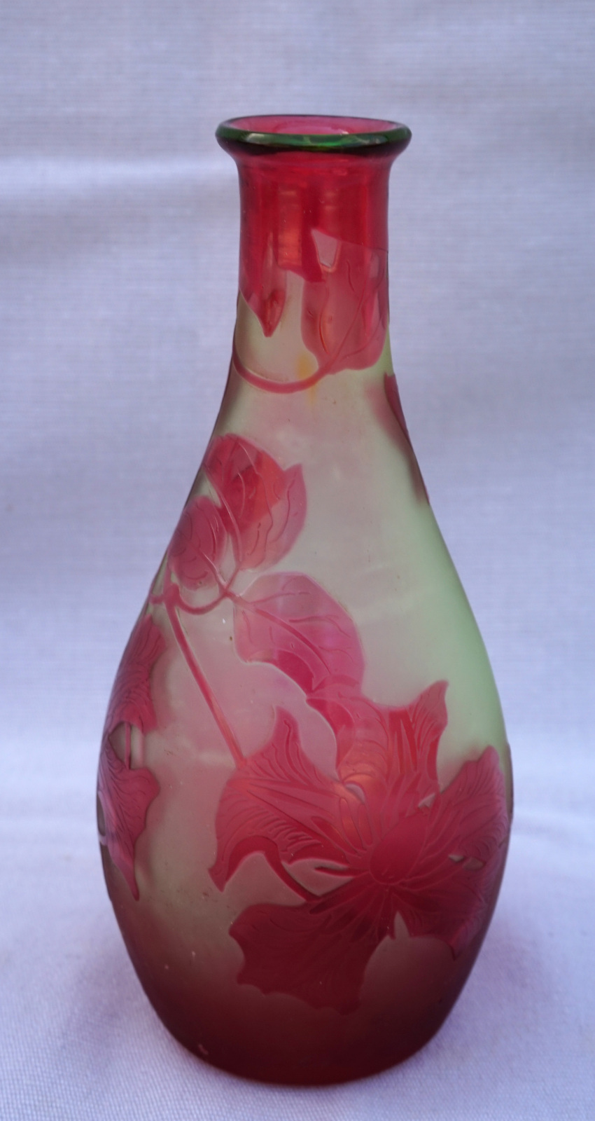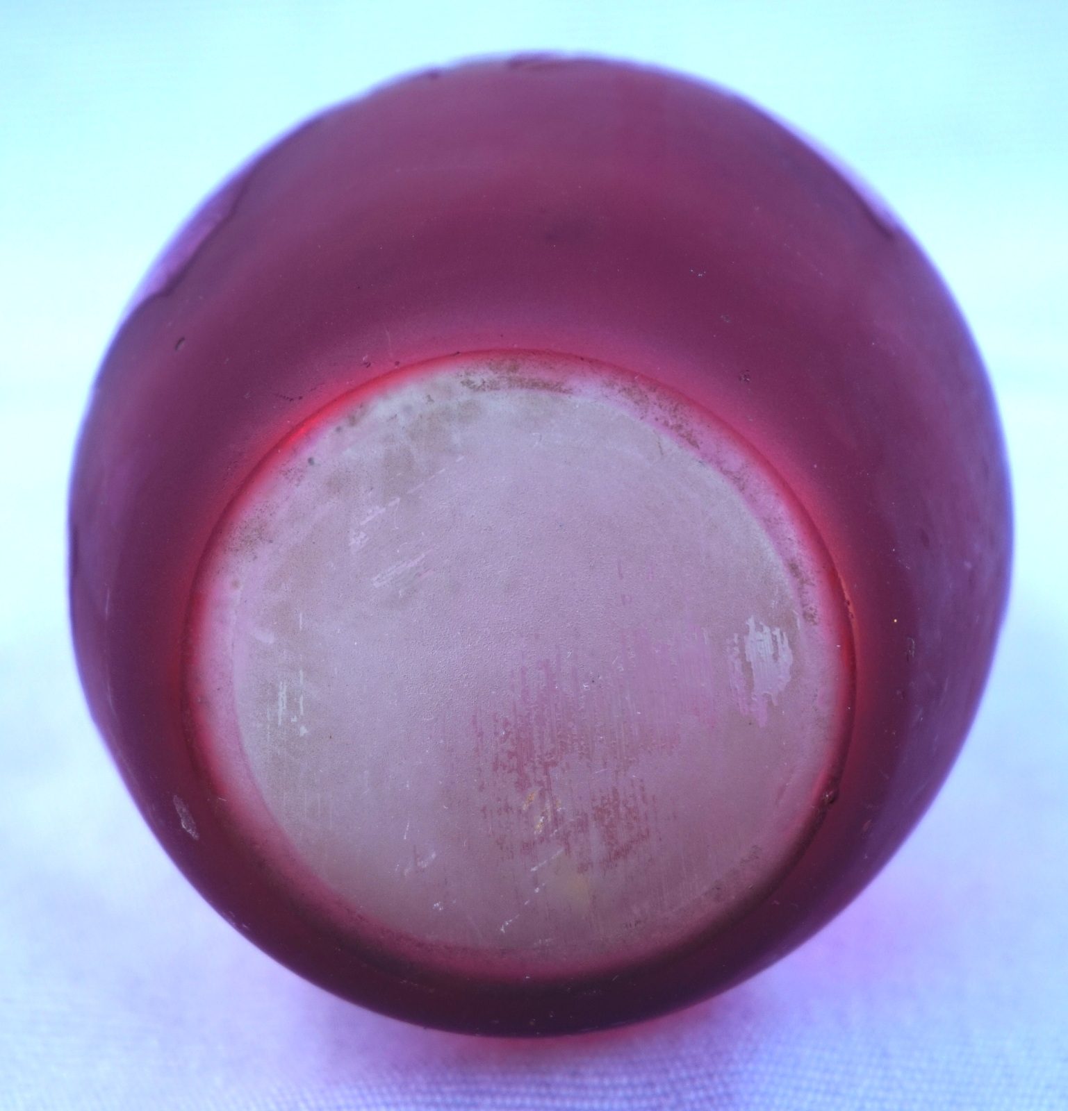 Vase en verre doublé gravé à l'acide d'un bouquet d'orchidée par Paul Nicolas D'Argental (1875-1953), élève d'Emile Gallé, école de Nancy vers 1920. Il est signé dans le décor d'Argental et croix de Lorraine. Hauteur 15.2 cm, diamètre au corps 6 cm. Parfait état.