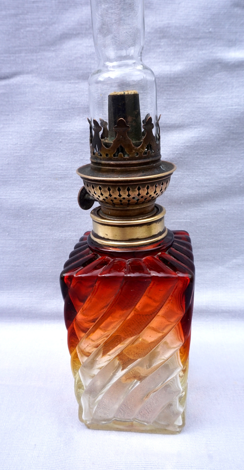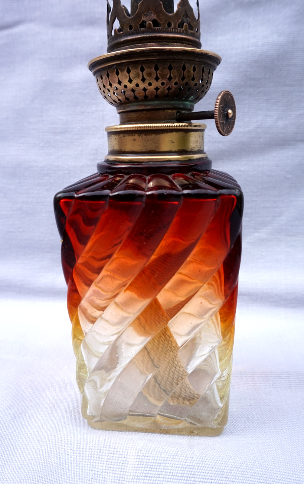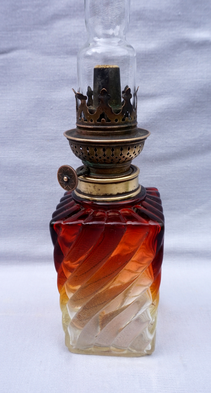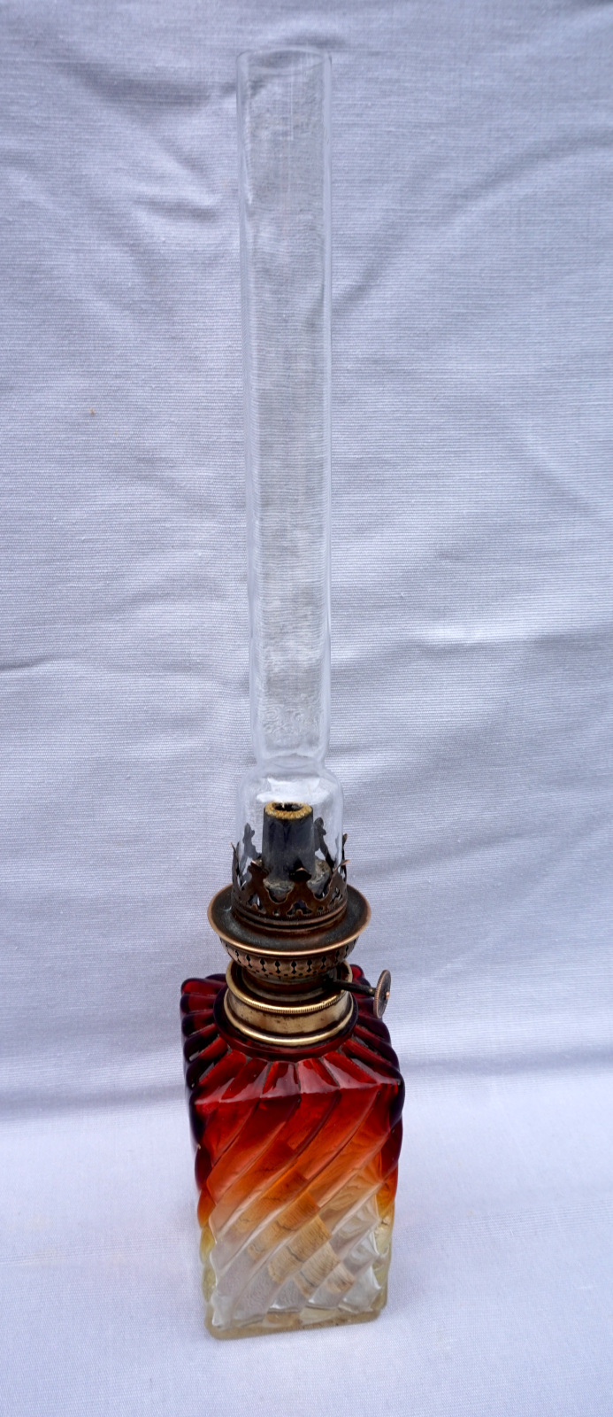 Lampe à pétrole en cristal tors et ambré par Baccarat vers 1880 avec un bruleur Matador. Hauteur totale 42cm, hauteur de la base 21.5cm, arrète par côté 7cm. Très bel état, complet, une égrenure sur un angle à la base voir photos.