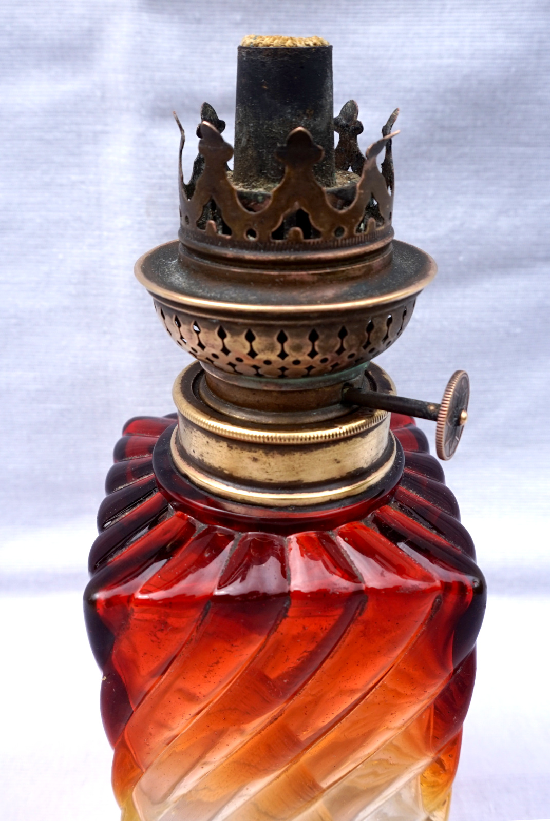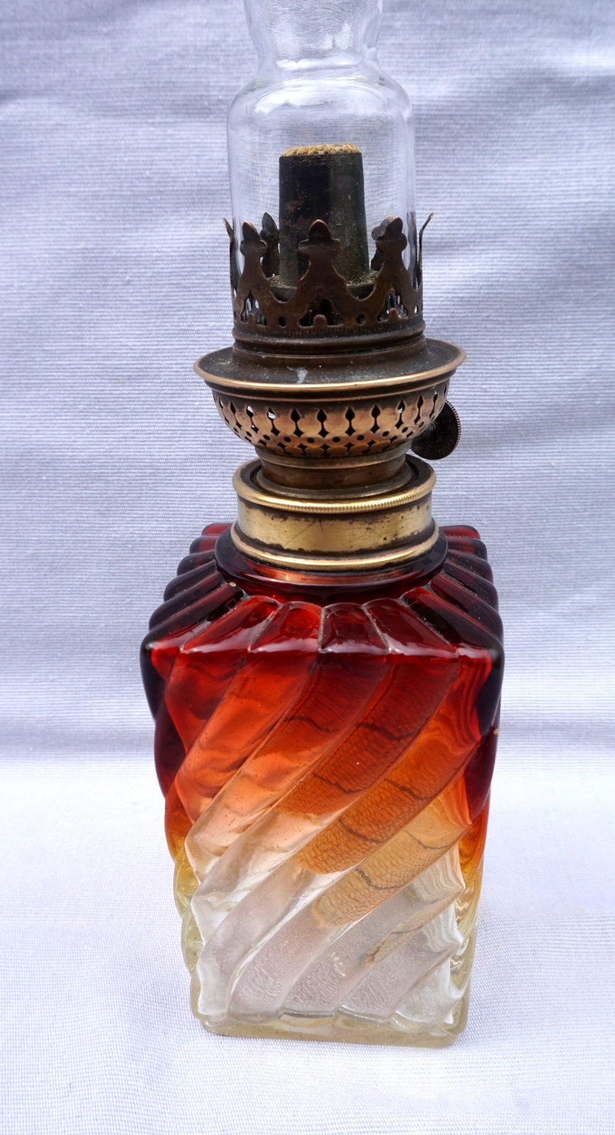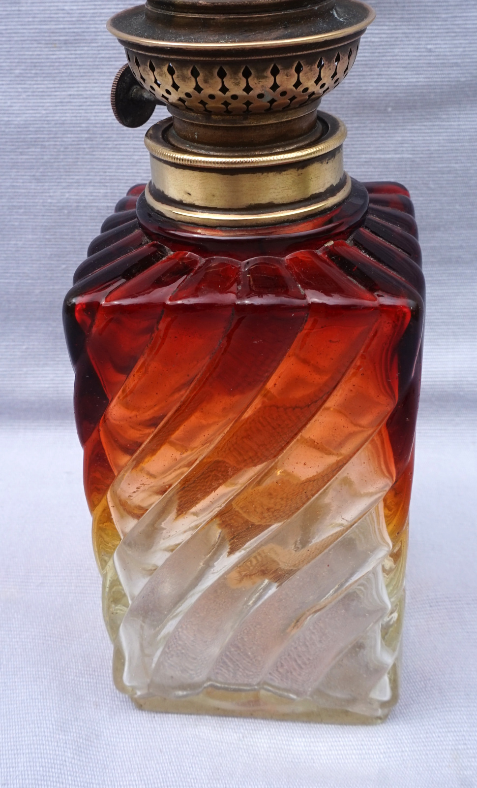 Lampe à pétrole en cristal tors et ambré par Baccarat vers 1880 avec un bruleur Matador. Hauteur totale 42cm, hauteur de la base 21.5cm, arrète par côté 7cm. Très bel état, complet, une égrenure sur un angle à la base voir photos.