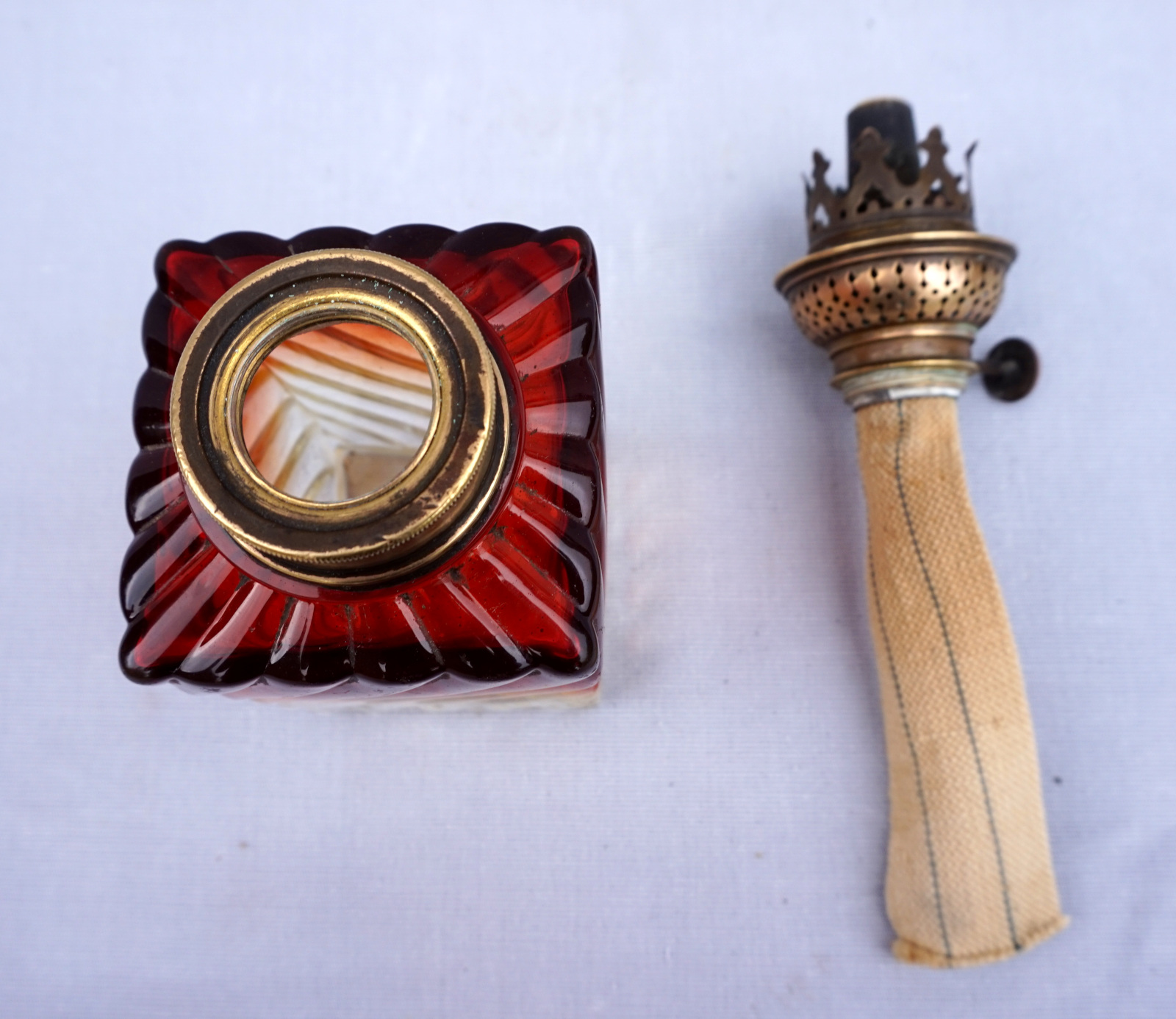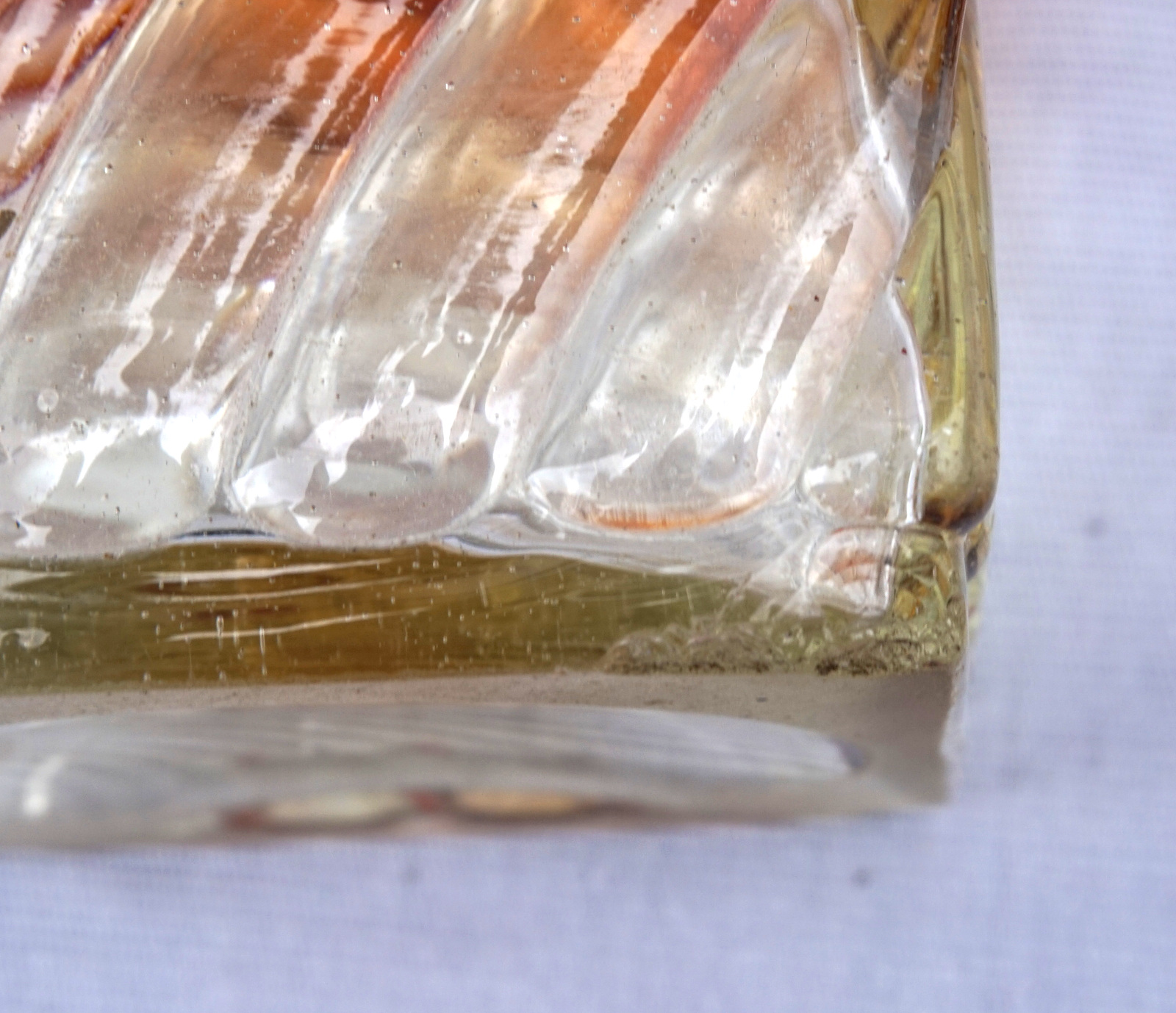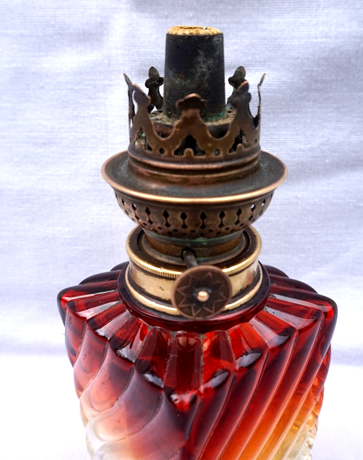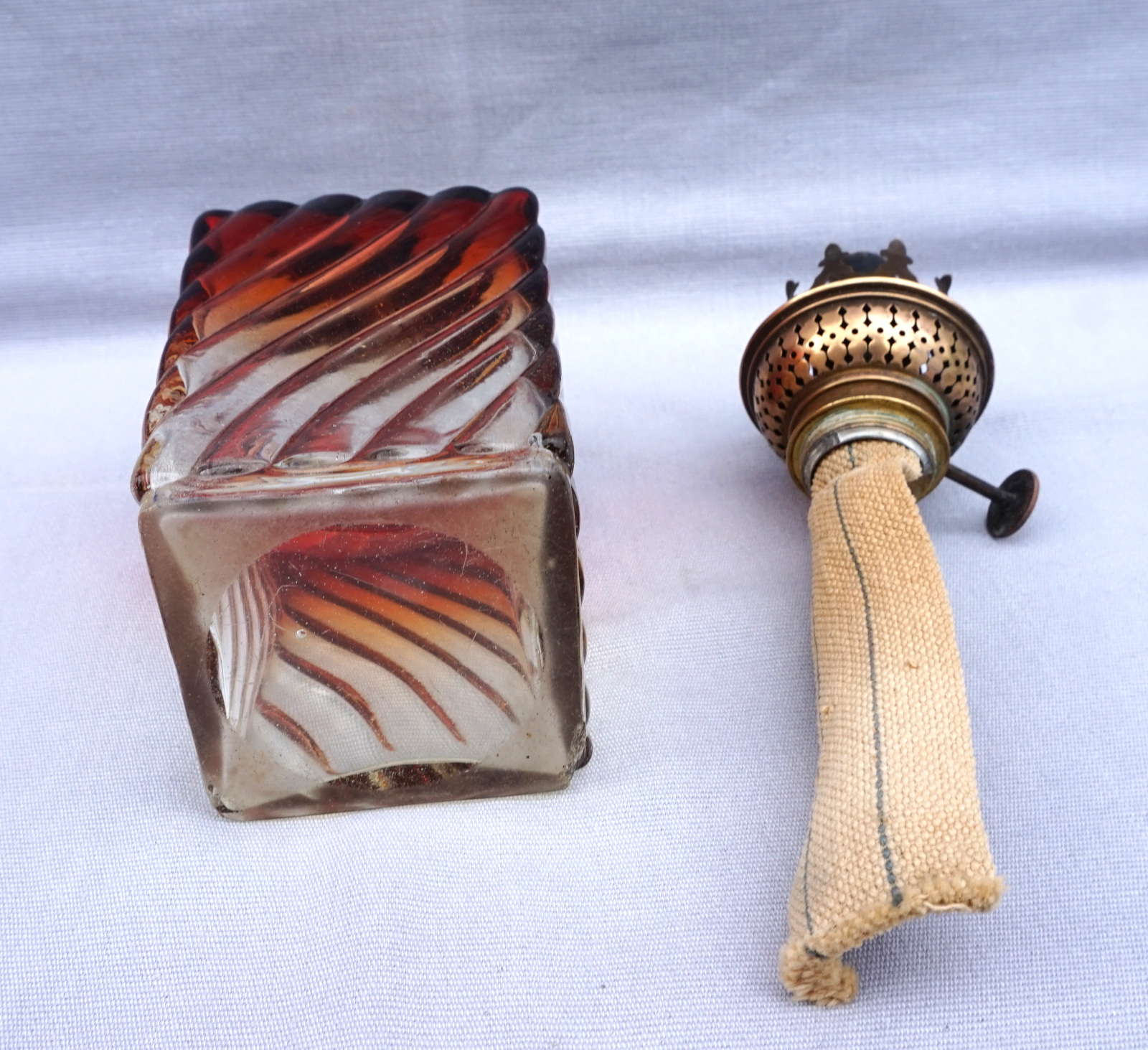 Lampe à pétrole en cristal tors et ambré par Baccarat vers 1880 avec un bruleur Matador. Hauteur totale 42cm, hauteur de la base 21.5cm, arrète par côté 7cm. Très bel état, complet, une égrenure sur un angle à la base voir photos.