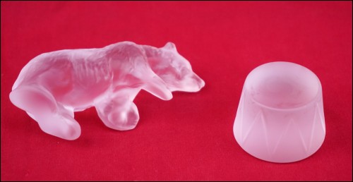 Ours et son tabouret en cristal dépoli par la Cristallerie Royale de Champagne milieu XX° siècle. Hauteur 7 cm, longueur 9.5 cm. Parfait état.