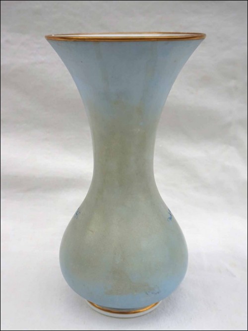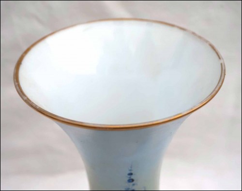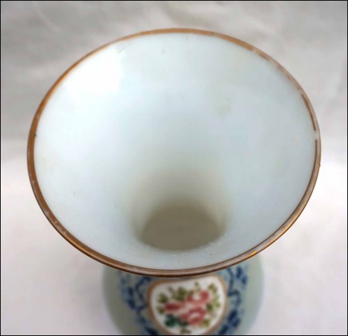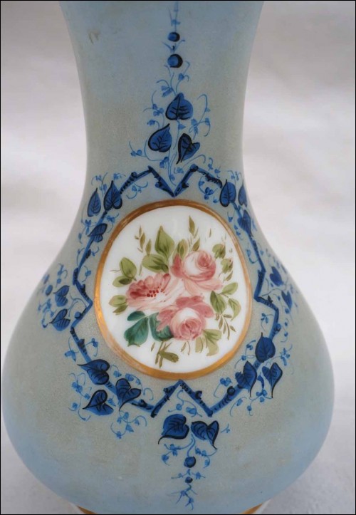 French blue opaline vase gilt enhanced baluster vase with hand painted medallion showing a bouquet of roses made during the second half of the 19th century Napoleon III period. 9 7/8" (25cm) height 5 1/4" (13.5cm) diameter. Good condition the gilt borders are slighty used as shown by the following pictures.