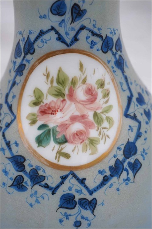 Blue Opaline Baluster Vase Hand Painted Roses Medallion 19th C