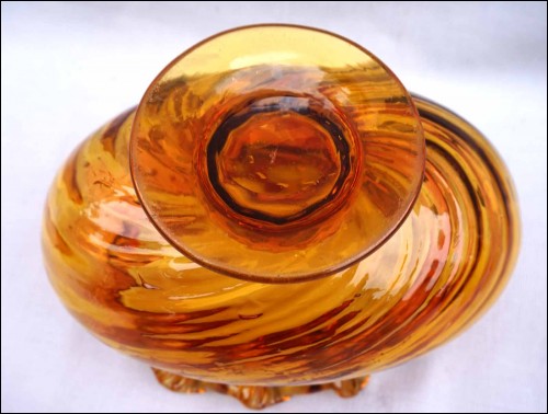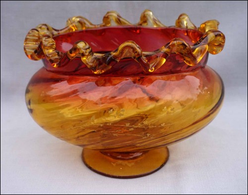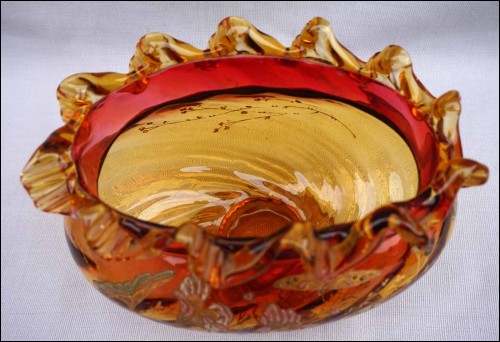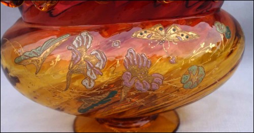 Jardinière vase ovale amberina en cristal de Bohème émaillé de fleurs et papillons, deuxième moitié XIXe siècle. Il est travaillé à la pince et son pontil a été meulé, atribué à Harrach. Très bel état. Hauteur 15,2 cm, largeur 21 cm, profondeur 13 cm.