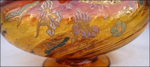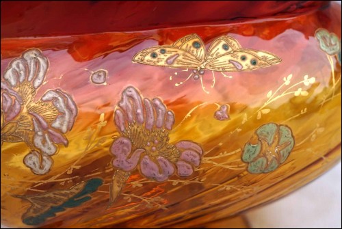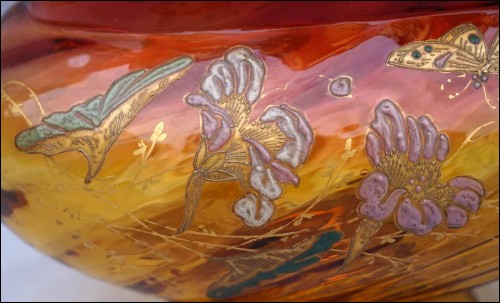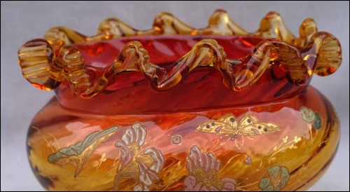 Bohemian Art amberina glass oval vase with scalloped edge, hand painted gilt and enameled painted decor showing butterflies, flowers and leaves made during the second half of the 19th century. 8 1/4" (21cm) width, 5 1/8" (13cm) depth, 6" (15.2cm) height. Perfect condition as shown by the following pictures.