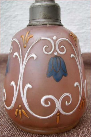 Bohemian perfume bottle in enameled and gilt glass. The pattern with great color of enamel and gold is hand painting on a rose opaque glass. It is mounted with tin and the screw works not very well. Good condition for the glass.