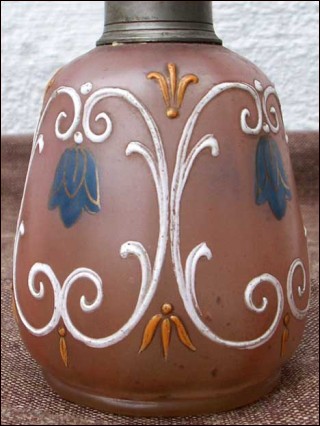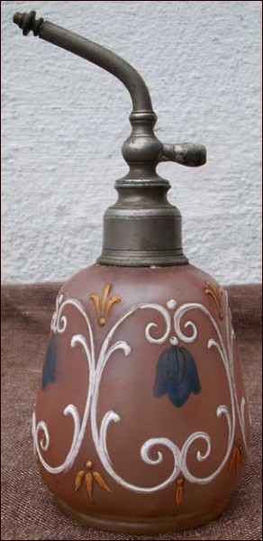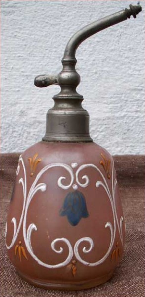 Vaporisateur en verre émaillé vers 1920. L'émaillage est rehaussé or sur les fleurs. Il est monté étain et la vis ne ferme plus. Bon état. Hauteur 15,5 cm.