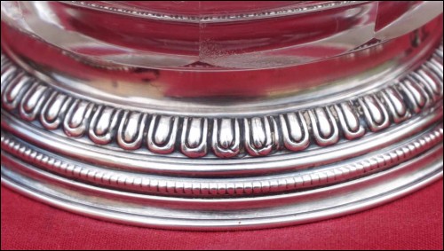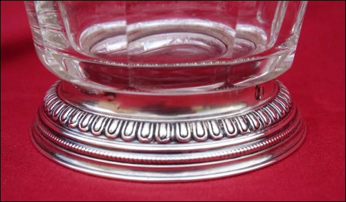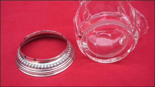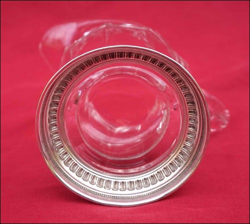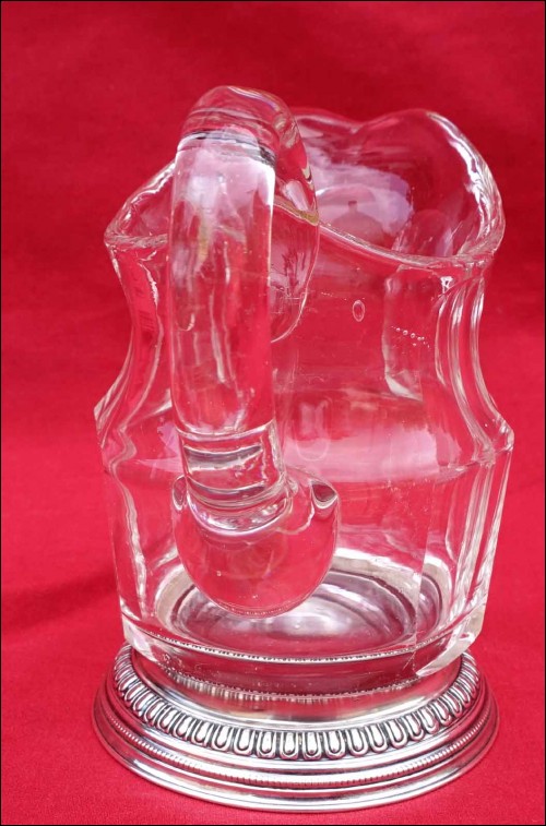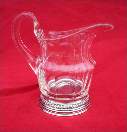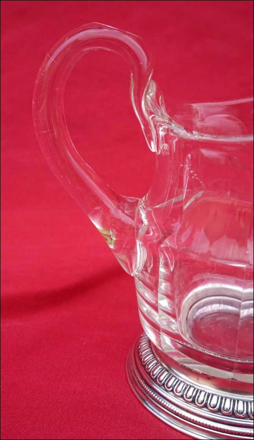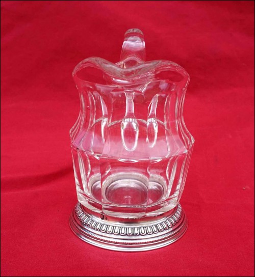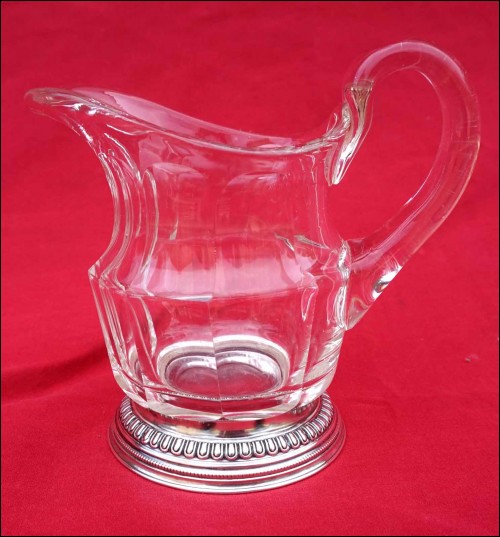 Petit pichet, crémier en cristal taillé monté sur socle argent, vers 1900. Poinçon Alexandre Hoden, 1899 et Minerve. Largeur, anse au bec, 11cm, hauteur 9.5 cm, poids total 180gr. Parfait état pour le cristal, le socle en argent massif à deux petits chocs et n'est pas scellé.