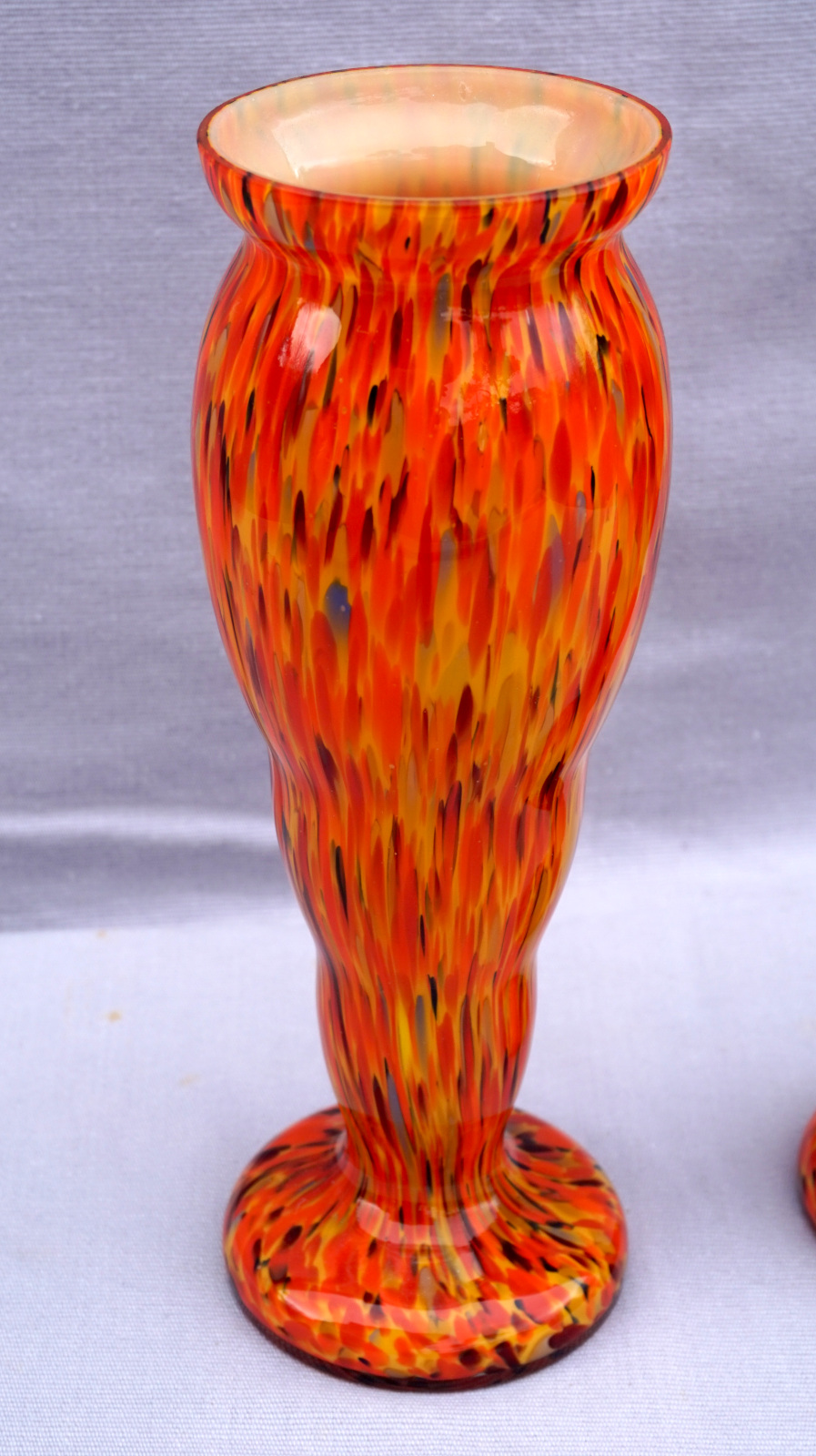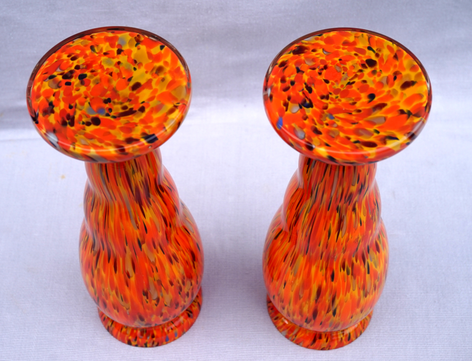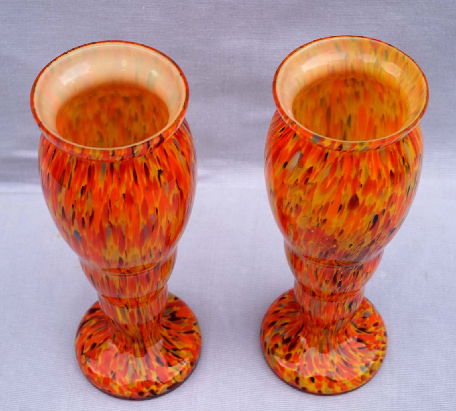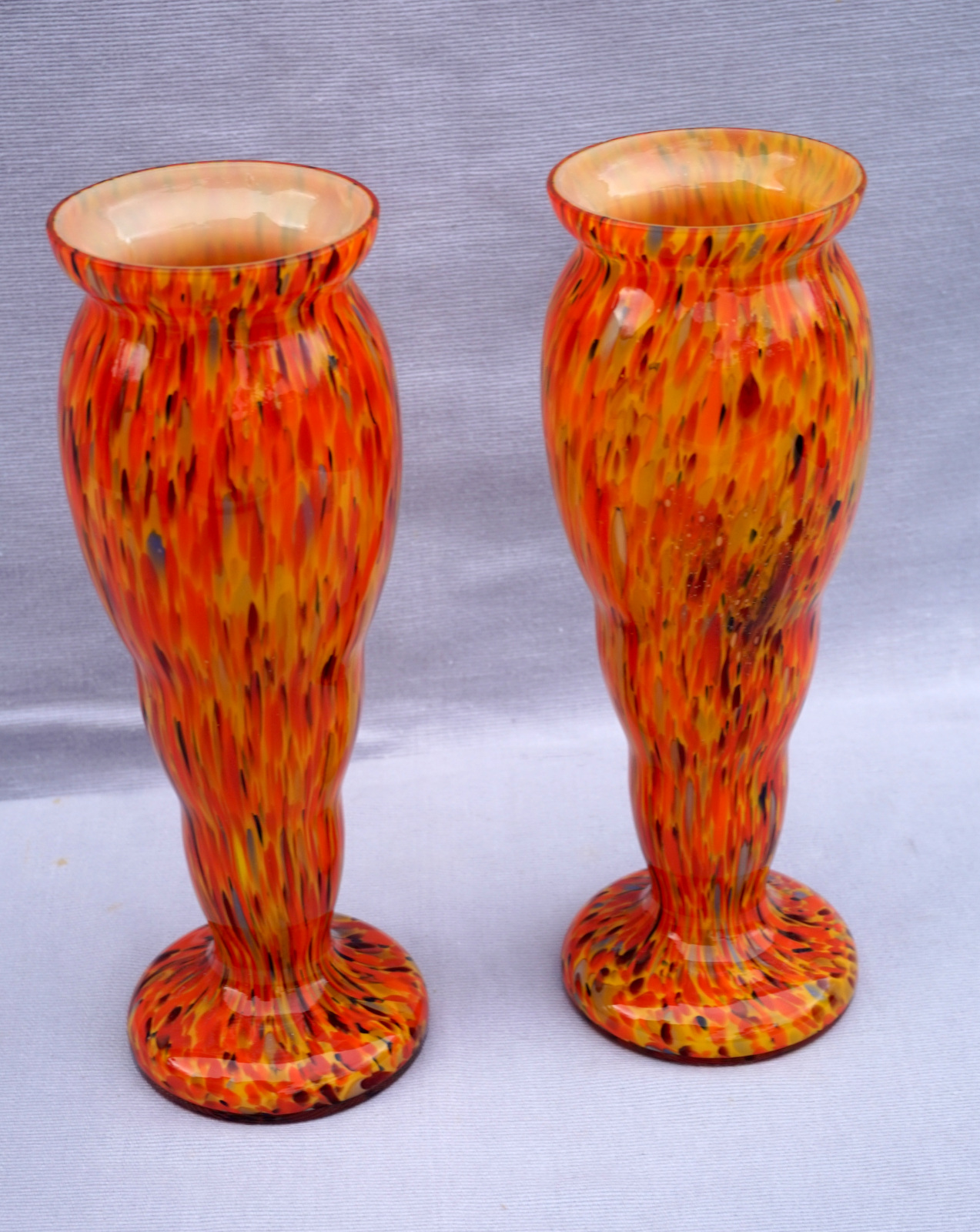 Czech Art Glass Orange Splatters Pair Vases 8 1/2"