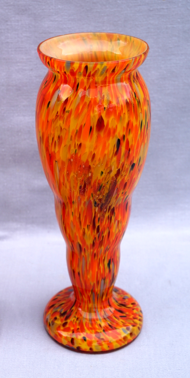 Vintage Czech art glass pair of orange vases with splatters made during the 1950's. 8 1/2" (21.5cm) height, 3" (7.5cm) diameter to the base. Perfect condition.