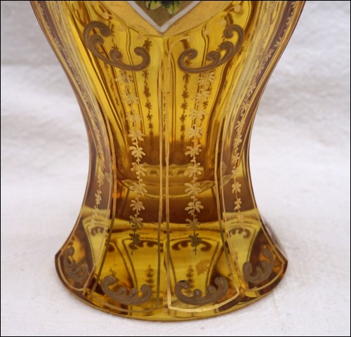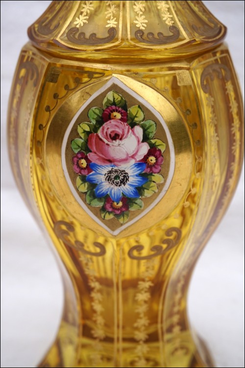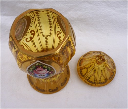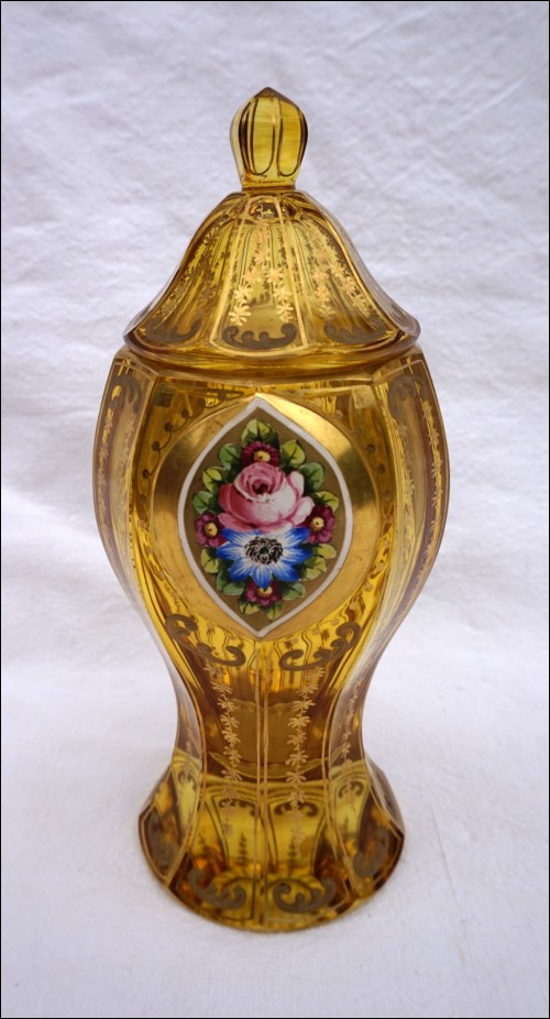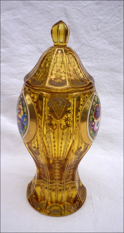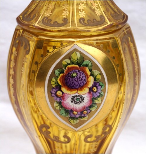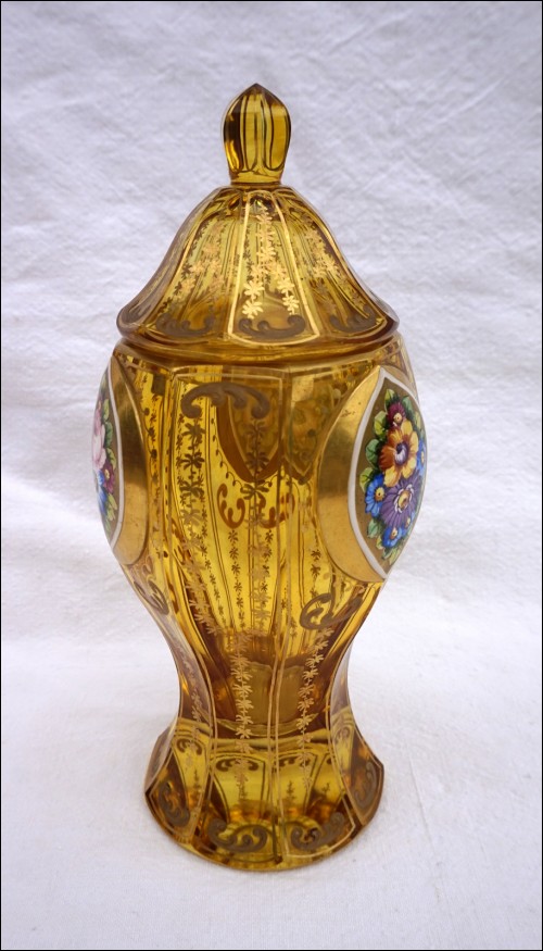 Pot à couvercle en cristal taillé doré réhaussé de filets or et de deux médaillons d'émaux fleuris, par Friedrich Egermann 1ère moitié du XIX° siècle. Hauteur 19cm, diamètre 7cm, poids 400gr. Reste d'un étiquette papier sur le fond.