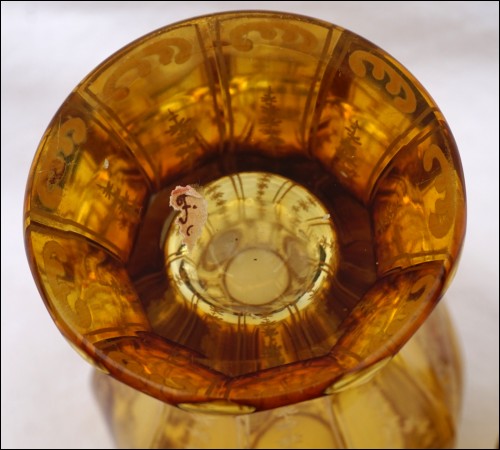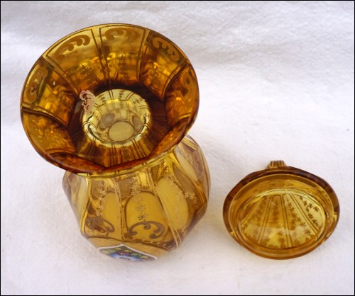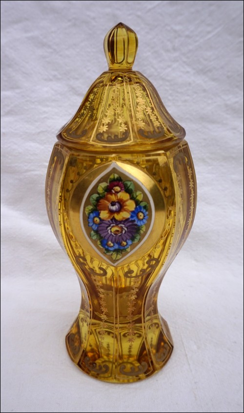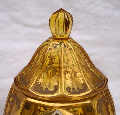 Bohemian Art glass gold cut crystal raised with gold enamel and flowers medallion lidded pot made by Friedrich Egermann during the first half of the 19th C. 7 1/2" (19cm) height, 2 3/4" (7cm) diameter to the base. Perfect condition with a bit of paper label on the back as shown by the following pictures.