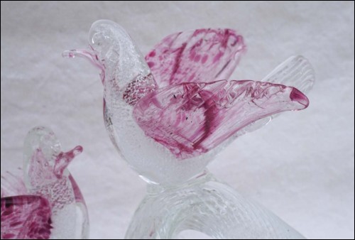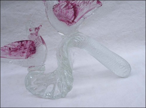 Pair de colombes en verre de Murano, symbole d'amour et de mariage, travail de Flavio Poli, vers 1950. Très bel état. Hauteur 17,7cm, largeur 25,5cm, profondeur 14cm.