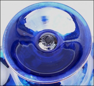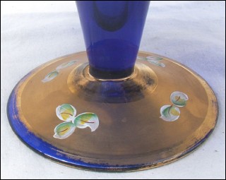 Large footed and scalloped dish in blue cobalt crystal glass with gilt enhancement and flowers hand painted made by Egermann Czech Art factory. Perfect condition only a few small gilt worn on the foot. Mark of pontil. 7 7/8" high 11 7/8" diameter.