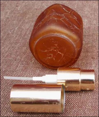 French perfume atomizer in amber crackeled glass made by Marcel Franck in Paris. Perfect condition. 4 1/8" high 1 3/4" diameter.