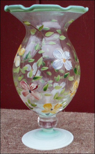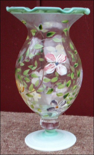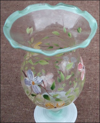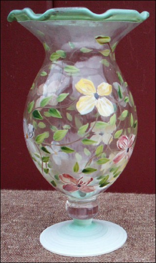 French enameled flowered vase with opaline base and scalloped edge hand worked made by the famous Pierre Schneider during the 1960's. Perfect condition. 6" high 3 1/2" diameter.