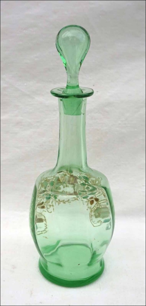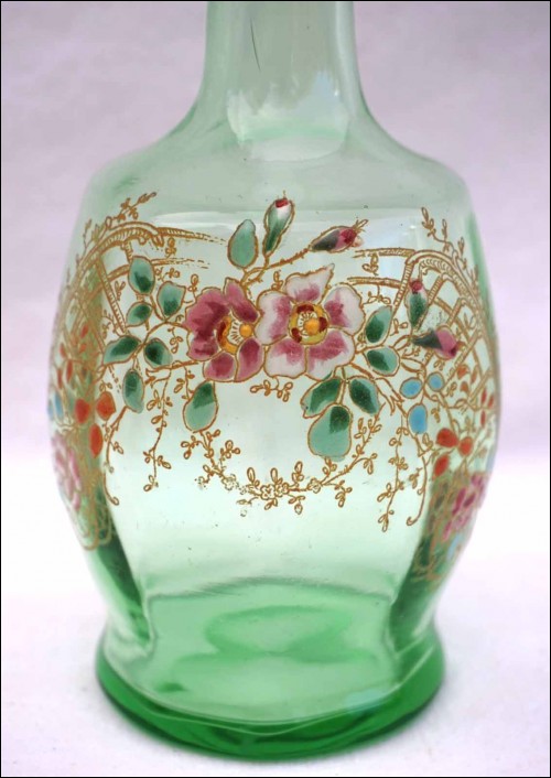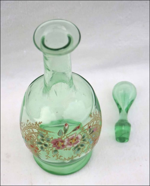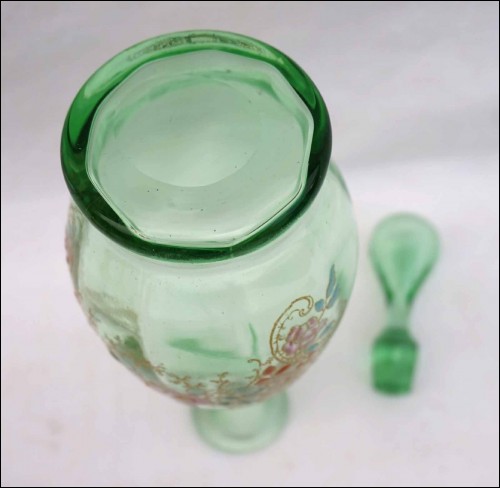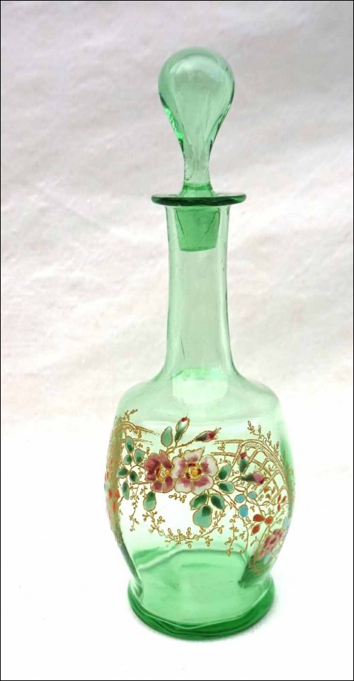 Carafe en verre émeraude émaillée de fleurs, manufacture Legras à St Denis, vers 1920. Elle est soufflée et possède son bouchon d'origine. Très bel état. Hauteur 22,5 cm.