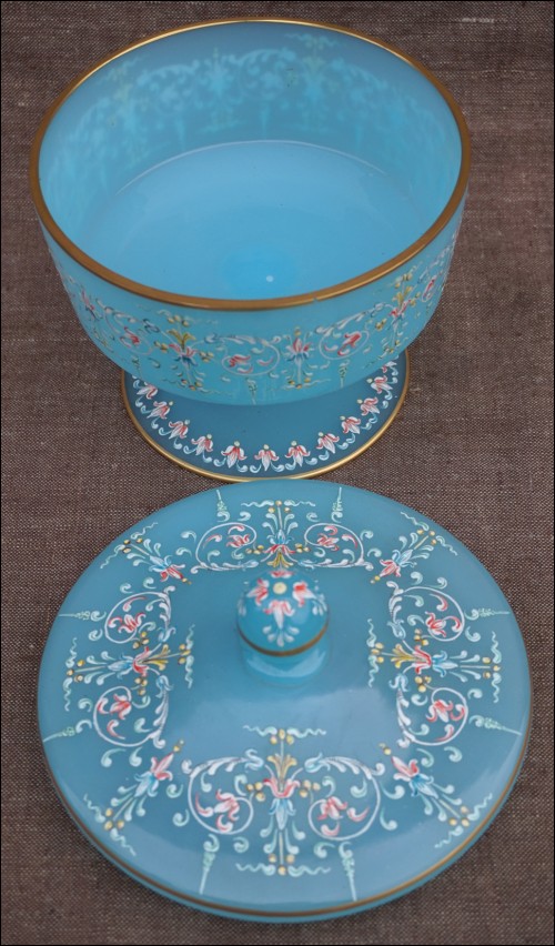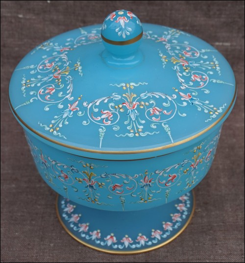 Rare opaline enameled glass footed bowl with lid made by Ludwig Moser in Bohemia during the end of the 19th century. Perfect condition, no chips , no hairlines or damages as presented on the following pictures. 8 1/4" height 7 1/4" diameter.