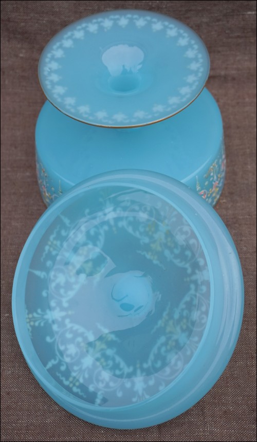 Drageoir bonbonnière sur pied en verre opalin émaillé de fleurs de Ludwig Moser, fin du XIXe siècle. Parfait état, peu d'usage. Hauteur 21 cm, diamètre 18,5 cm.