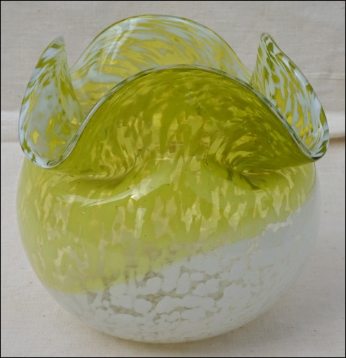 Art Deco Bohemian ruffled ball vase in clear glass with green and white spatter made by Luwig Mosër & Sohne in Karlovy Vary during the 1920's. Vase in blowned glass with tiny bubbles with broken pontil. 5 7/8" diameter 5 1/2" height. Perfect condition as presented on the following pictures.