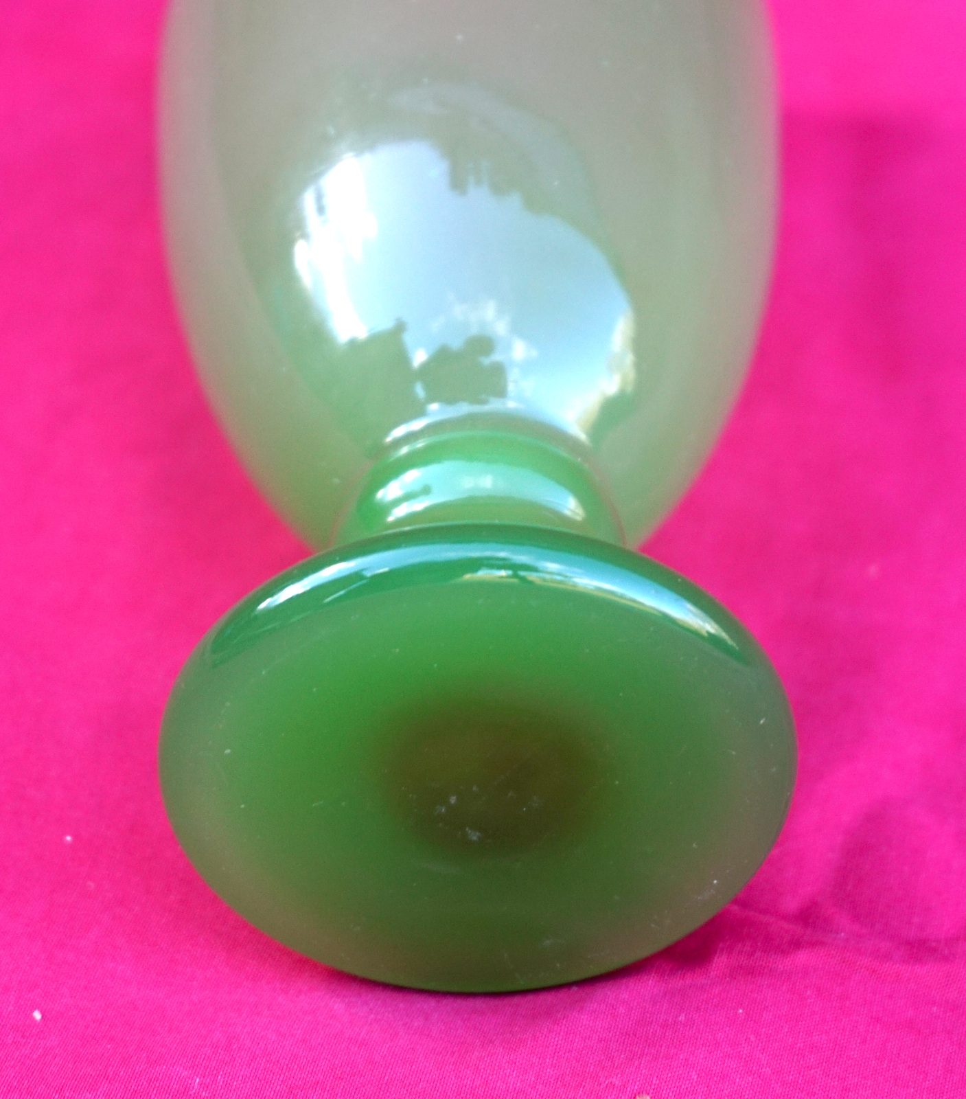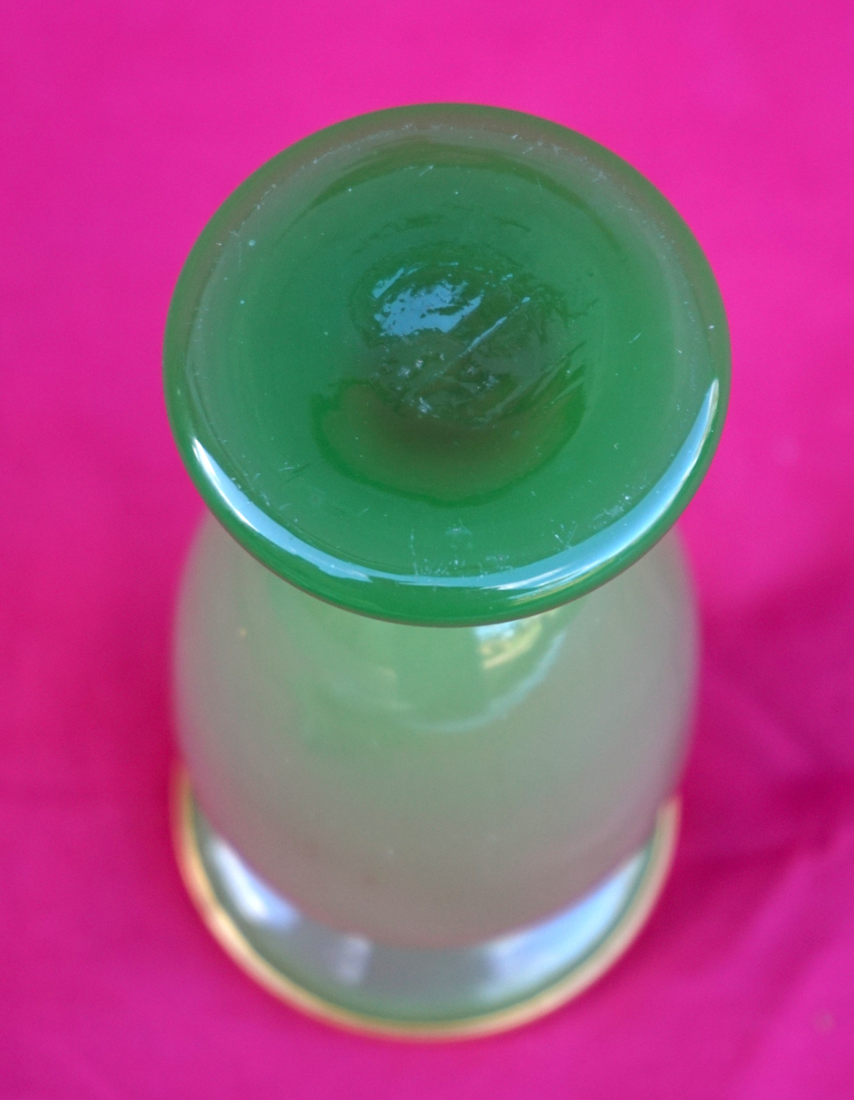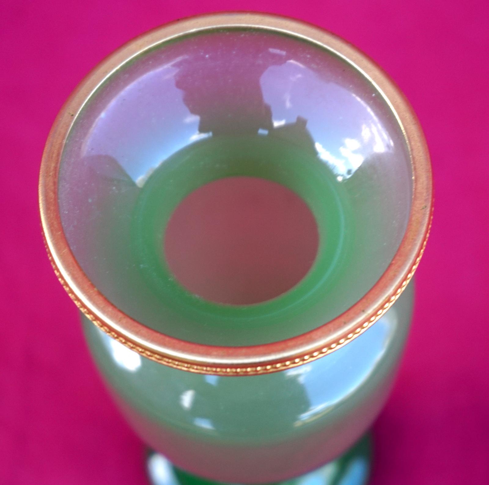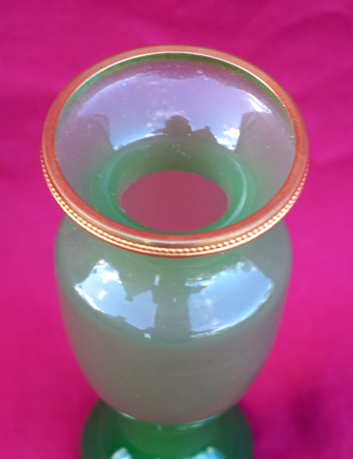 French Art glass green jade opaline crystal vase with beaded ormolu beaded ornement on the top made by Saint Louis France during the middle of the 19th century. 5 3/4" (14.7cm) height, 2 1/2" (6.4cm) diameter. Perfect condition