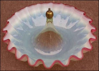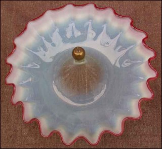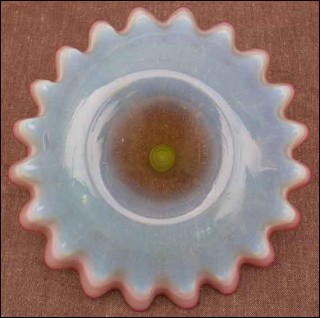 Scalloped bowl vase for remplacement of epergne in linen milk glass with cherry edge made by Thomas Webb in 1885. Perfect condition. 10"1/4 diameter 2"3/4 high.