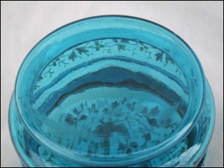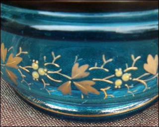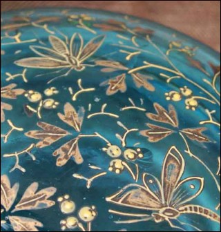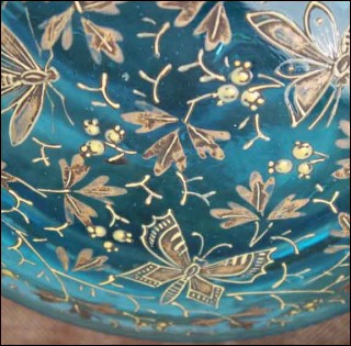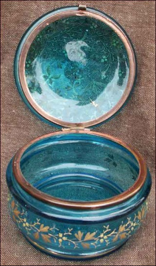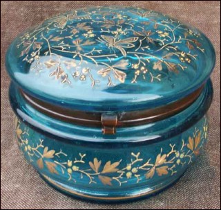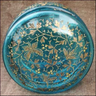 Trinket box in blue glass with butterfly flower gilt enameled decor made by the famous bohemian Moser studio. It opens with S hinge in gilt copper. Perfect condition it's signed 7 inside the lid. 4"3/4 diameter 3"1/2 hight.