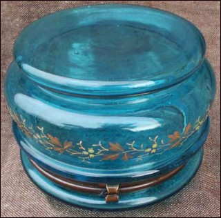 Grande boite à bijoux de Bohème en verre bleu émaillé d'or à décor de papillons de fleurs par Moser. Elle est en très bon état et épargnée 7 à l'intérieur du couvercle. Elle ouvre par une serrure en S, sa charnière est en bon état et elle ferme bien. Monture en cuivre avec reste de dorure. Très bon état. Diamètre 12 cm, hauteur 9 cm.
