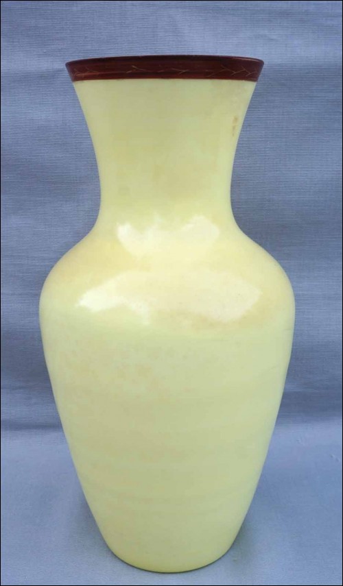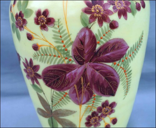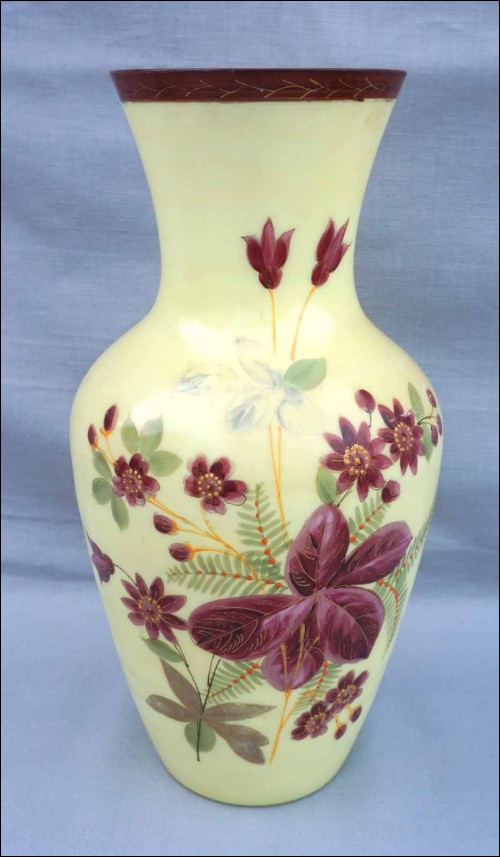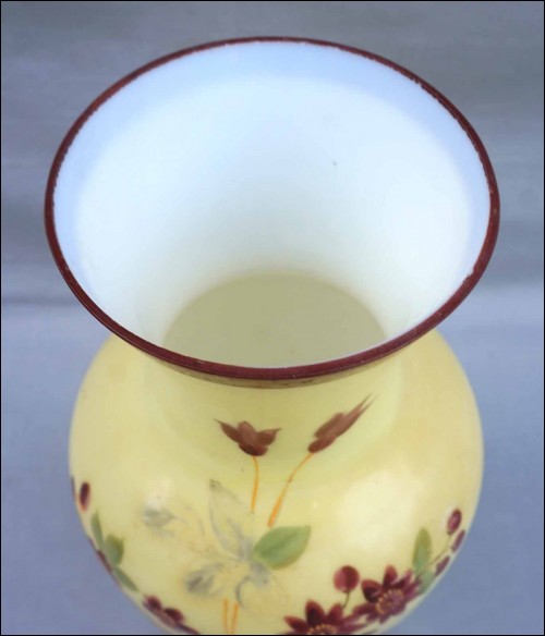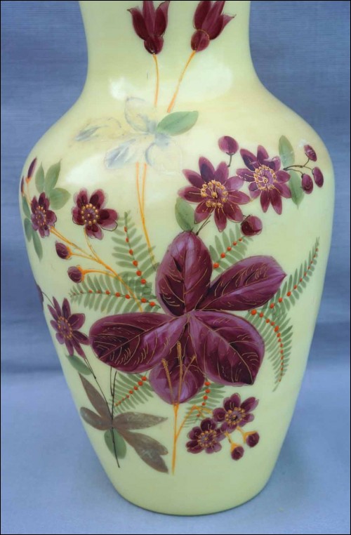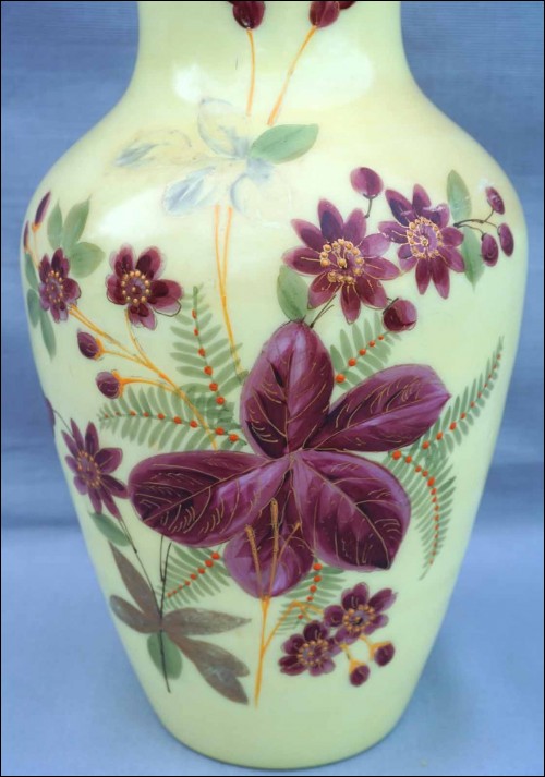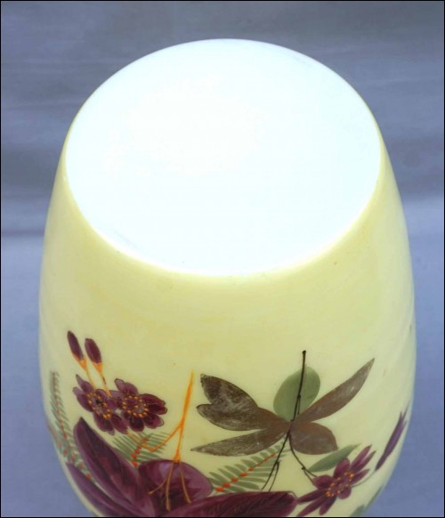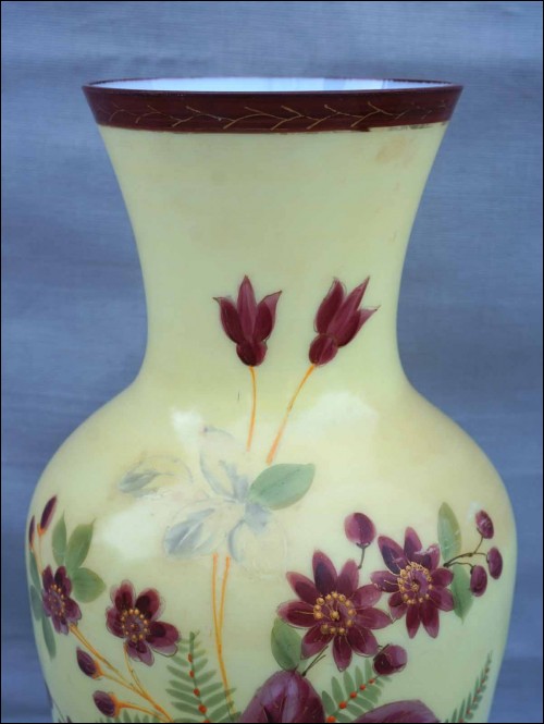 Victorian art glass hand painted enameled yellow opaline vase showing bouquet of flowers made during the second half of the 19th century. 12" (30.8cm) height, 6 1/2" (16.4cm) diameter. Perfect condition as shown by the following pictures.