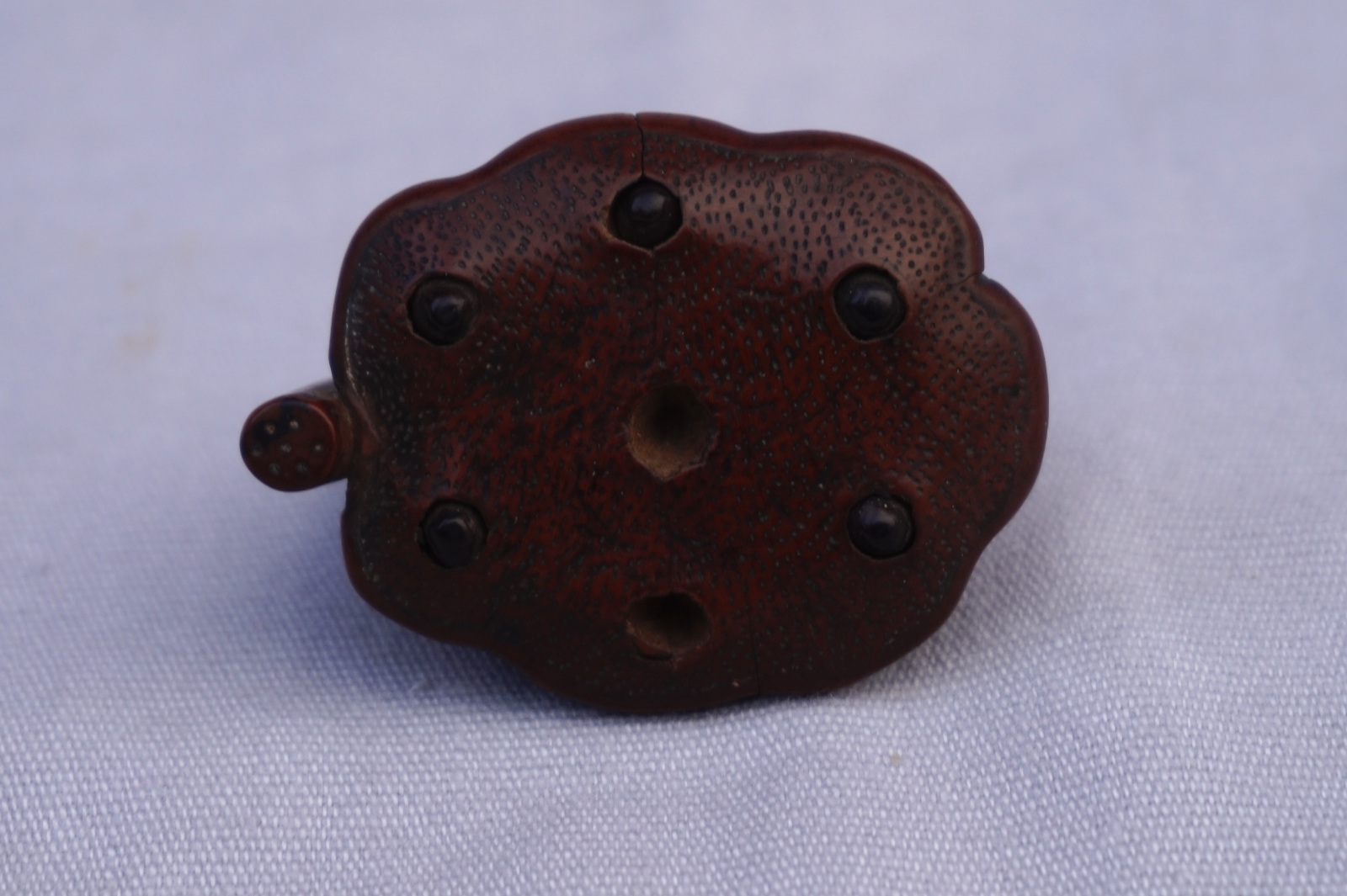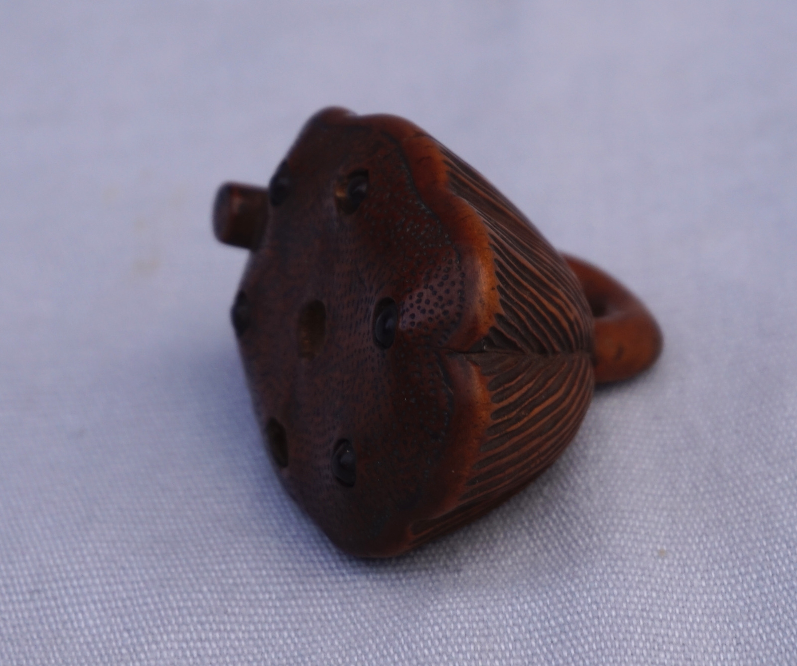 Antique netsuke reishi mushroom carved in boxwood with pearl inlay made during the middle of the 19th century, Edo period. 1 3/4" (4.5cm) height, 2" (5.1cm) width. Beautiful condition 2 pearls are missing as shown by the following pictures.