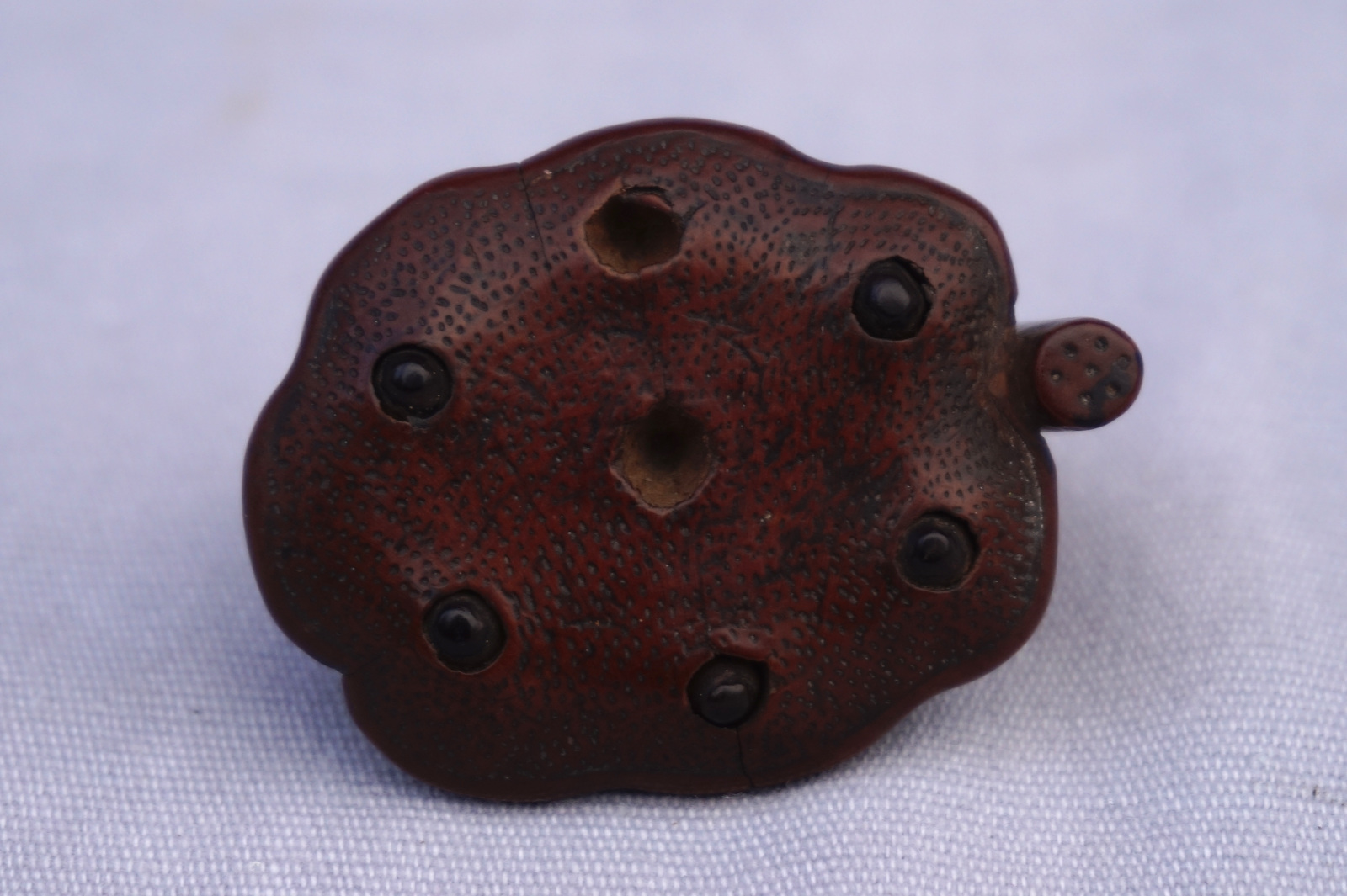Netsuke en forme de champignon de souche Reishi, réhaussé de perles, milieu XIXème siècle période Edo. Hauteur 4.5cm, largeur 5.1cm. Très bel état, 2 perles manquantes.