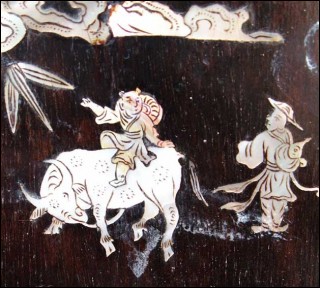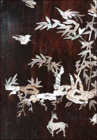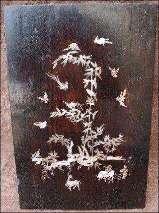 Panneau Indochinois en bois de palissandre incrusté de nacre gravée vers 1880. Il est agrémenté de personnages buffles cerfs oiseaux et bambou. Bon état pas de manque. Hauteur 32 cm, largeur 21 cm, épaisseur 1 cm.