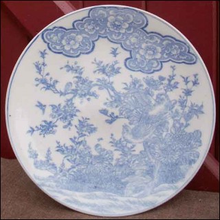 Antique blue and white porcelain dish made in Arita Japan during the 19 th century Meiji period. The hand painted buddhist shows happiness mushrooms cloods, birds and japanese lantern. Good condition. 12" diameter.