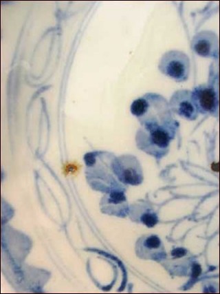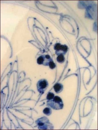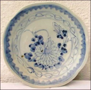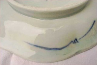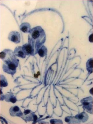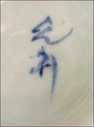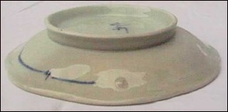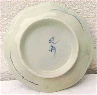 Blue and white bowl plate with pedestal in chinese porcelain made during to the second half of the 19th century. The hand painted Kangxi style flovered pattern depicts chrysanthemum with heavy underglaze. On the back mark of potter in Hiragana character. Perfect condition small fire chips in the glaze. 6 5/8" diameter.