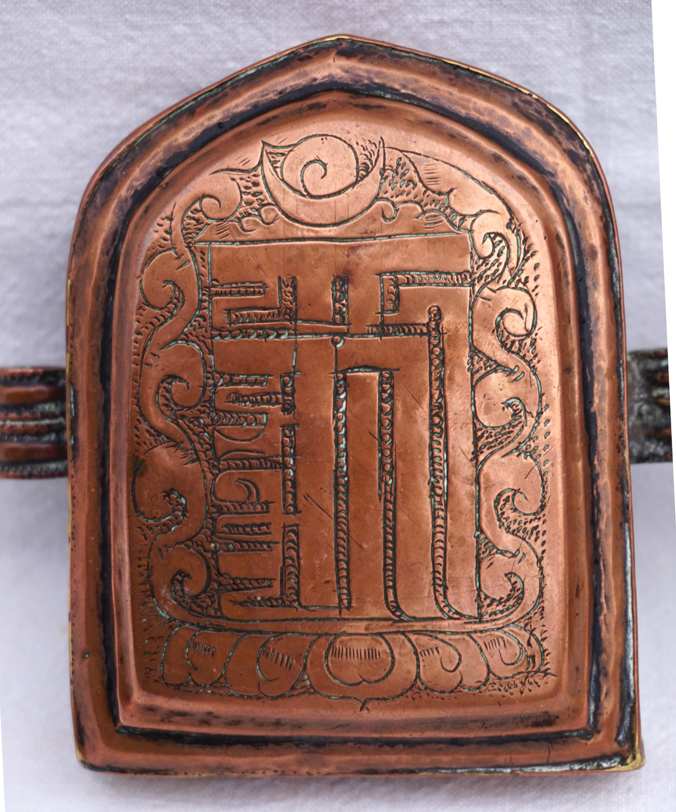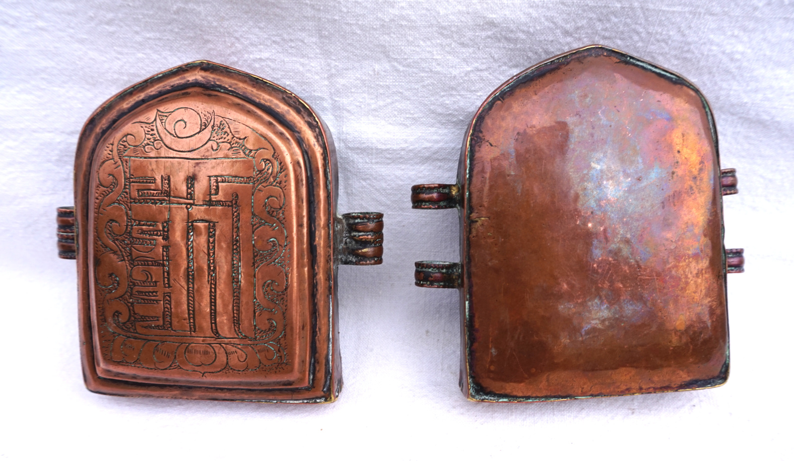 Ghau Gao reliquaire Bouddhiste en cuivre du Tibet. Hauteur 11 cm, largeur 12 cm, épaisseur 5.2 cm, poids 198 gr. Très bel état.