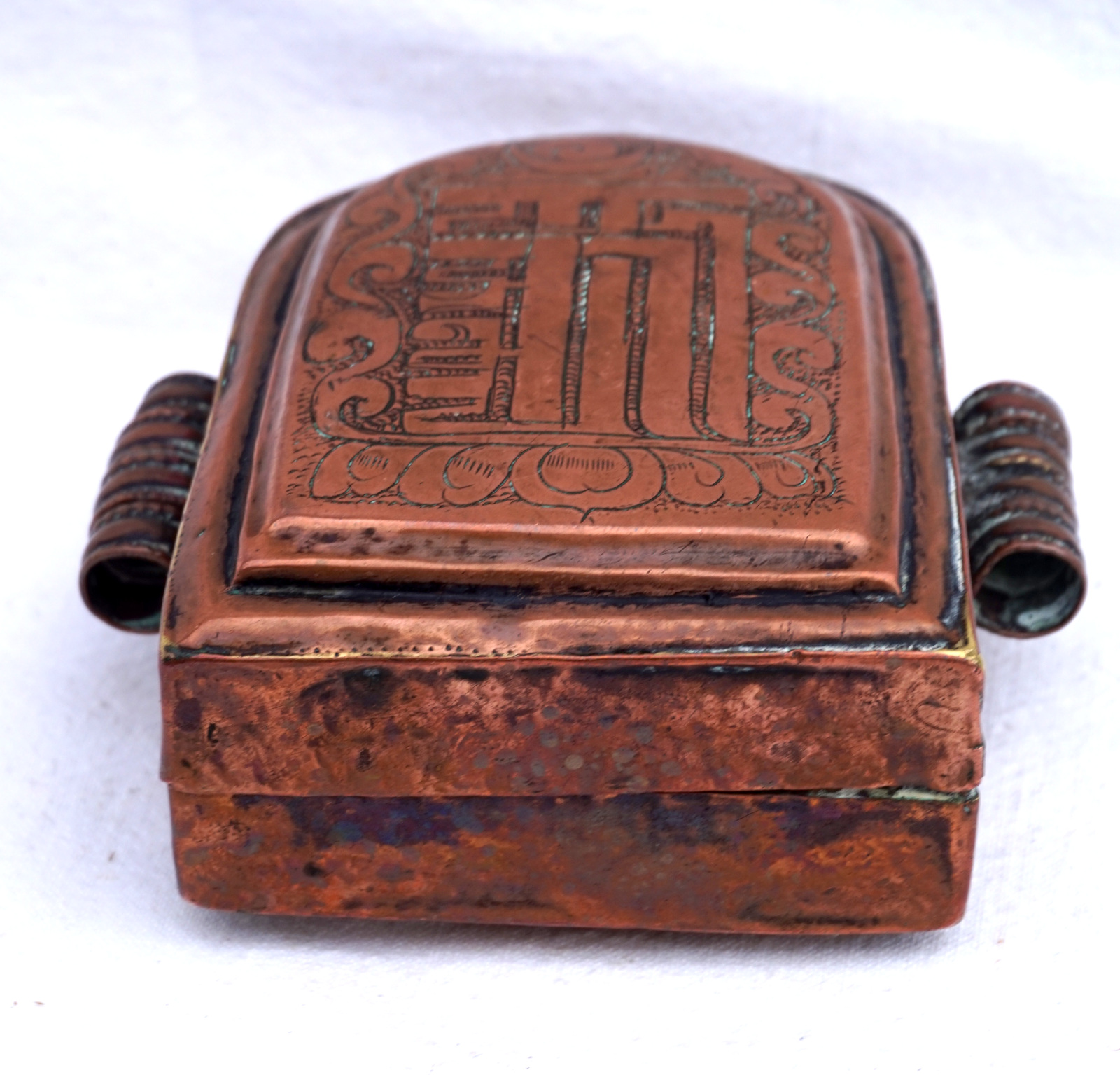 Gau, Gao, Ghau Buddhist reliquary box conatiner Tibeatn copper made during bthe 19th century. 4 1/4" (11cm) height, 4 3/4" (12cm) width, 2" (5.2cm) depth, weight 6.98oz (198 grams). Beautiful condition as shown by the following pictures.