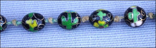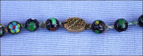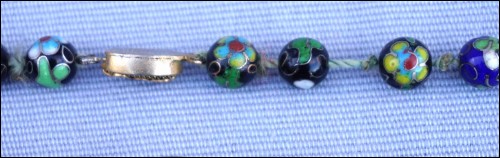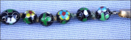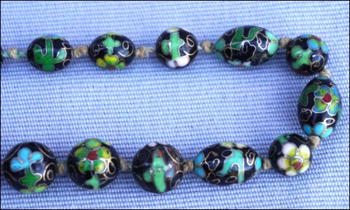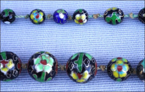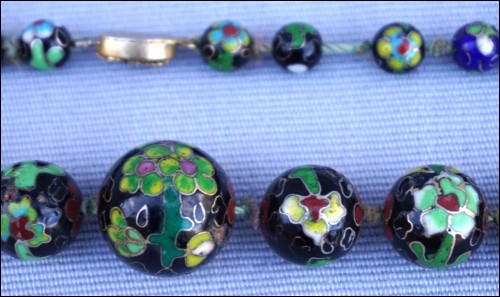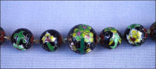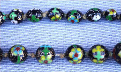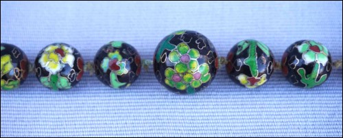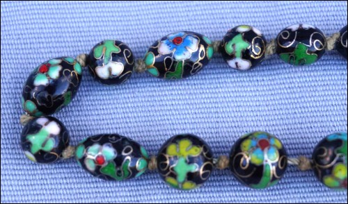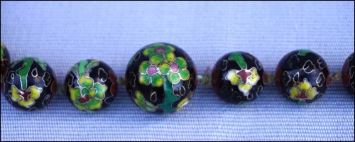 Vintage black cloisonne showing flowers knotted beads necklace made in China. 13 5/8" (34.5cm) closed length, 7/8" (2.1cm) to 3/8" (0.8cm) bead diameter, weight 3.633oz (103grams). Good condition, the slide clasp is blocked, as shown by the following pictures.
