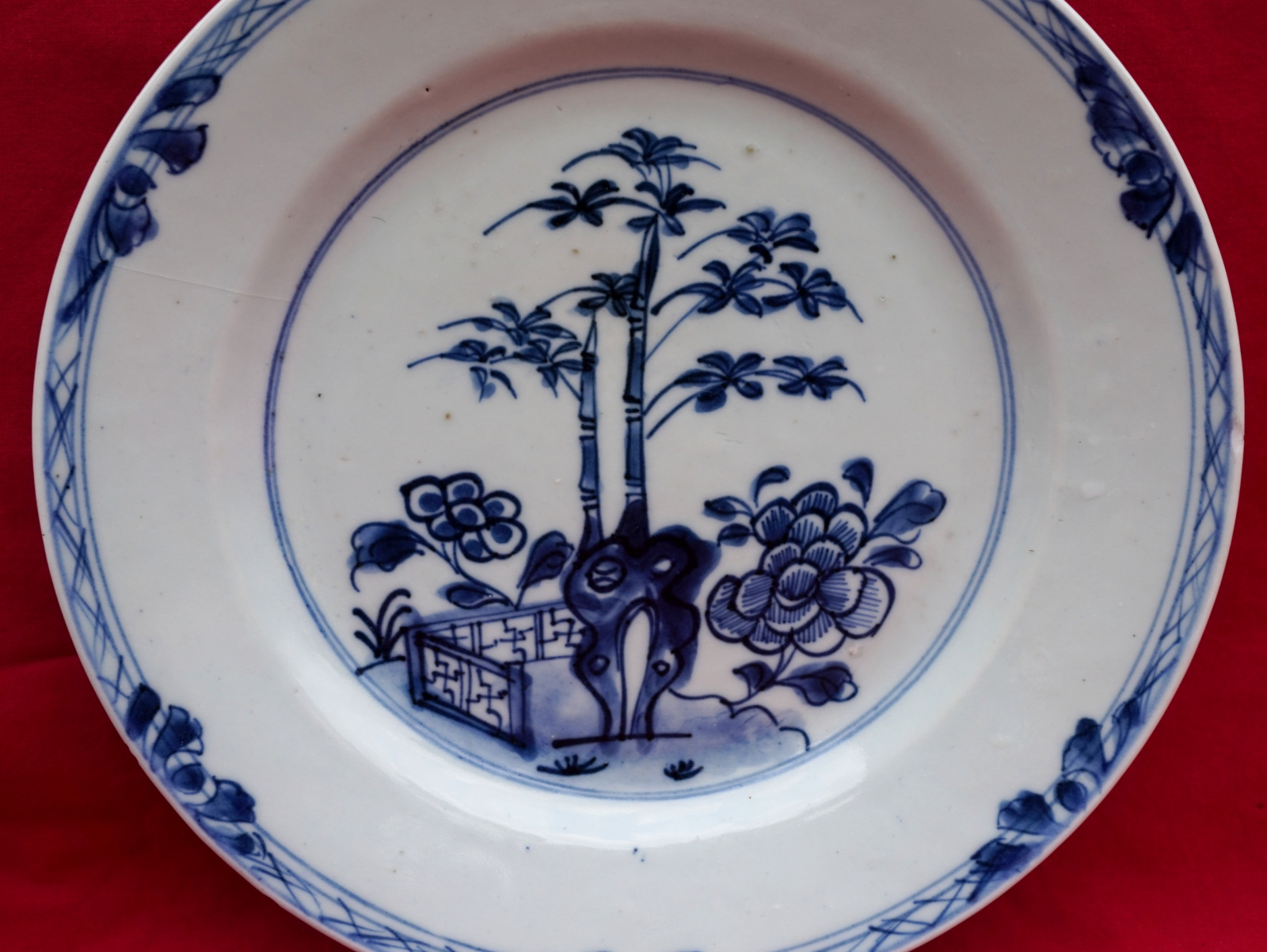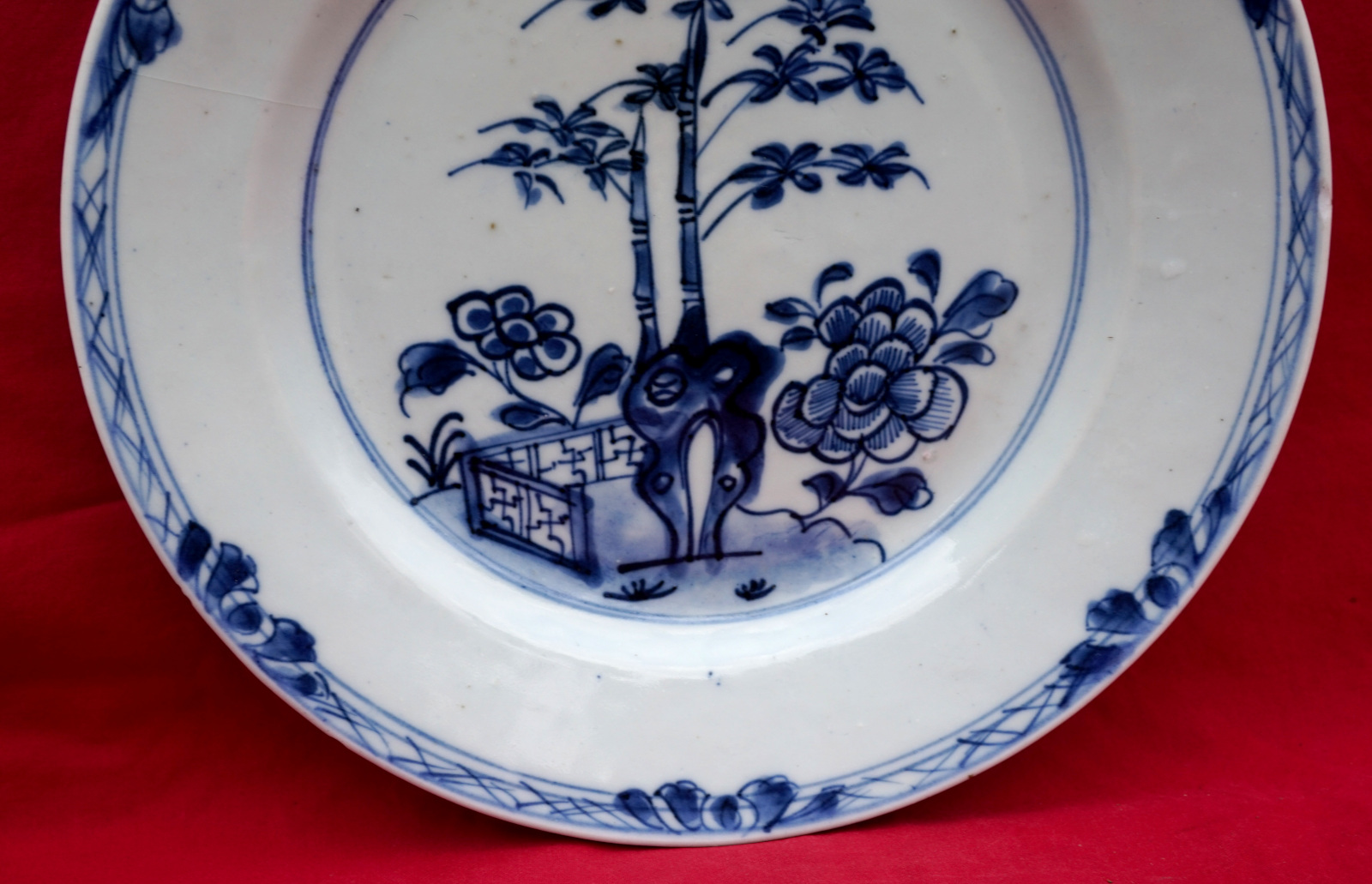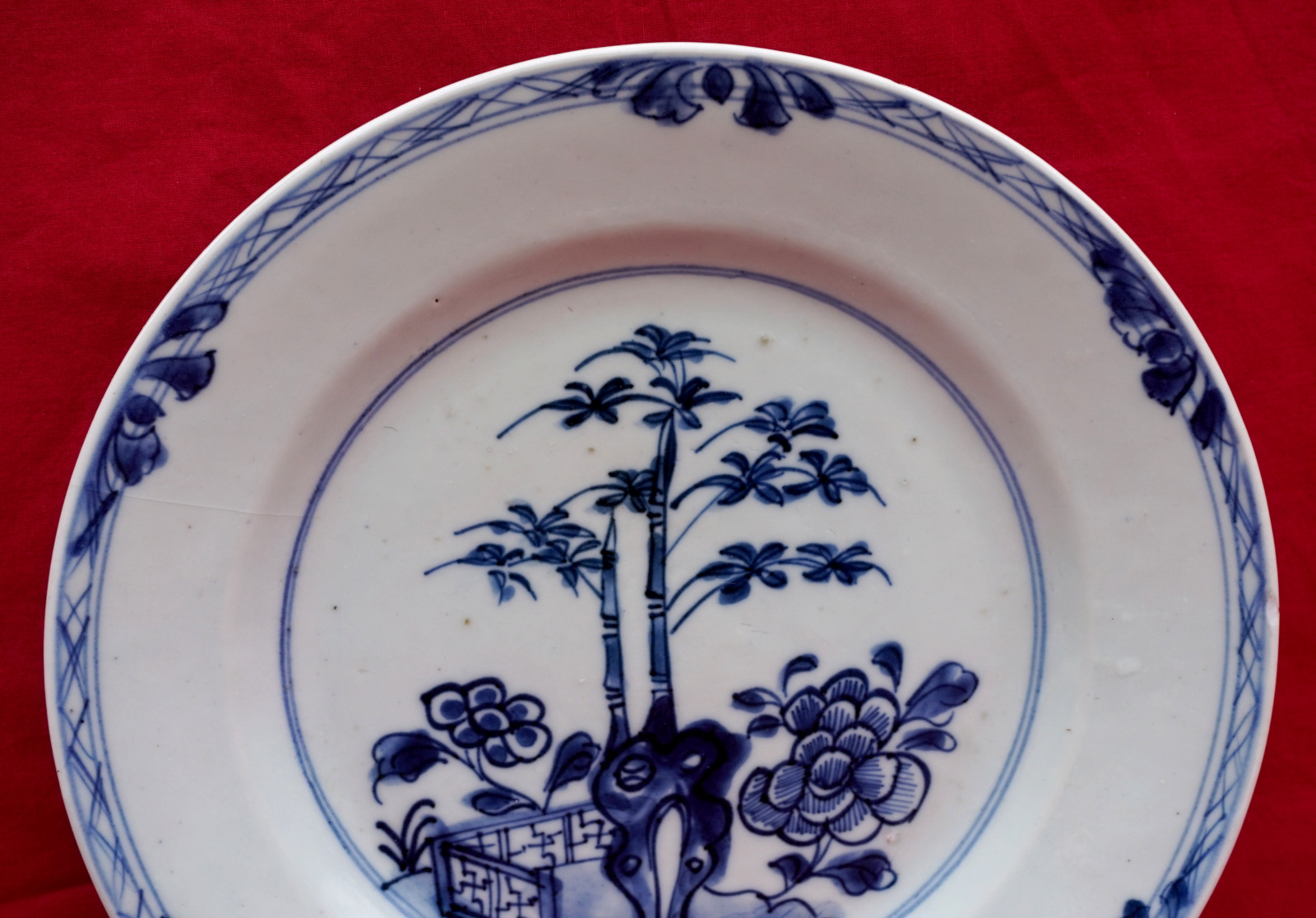 Chinese blue and white porcelain plate showing tree, flowers in a garden, Kangxi area. 9 1/2" (23.5cm) diameter. Perfect condition