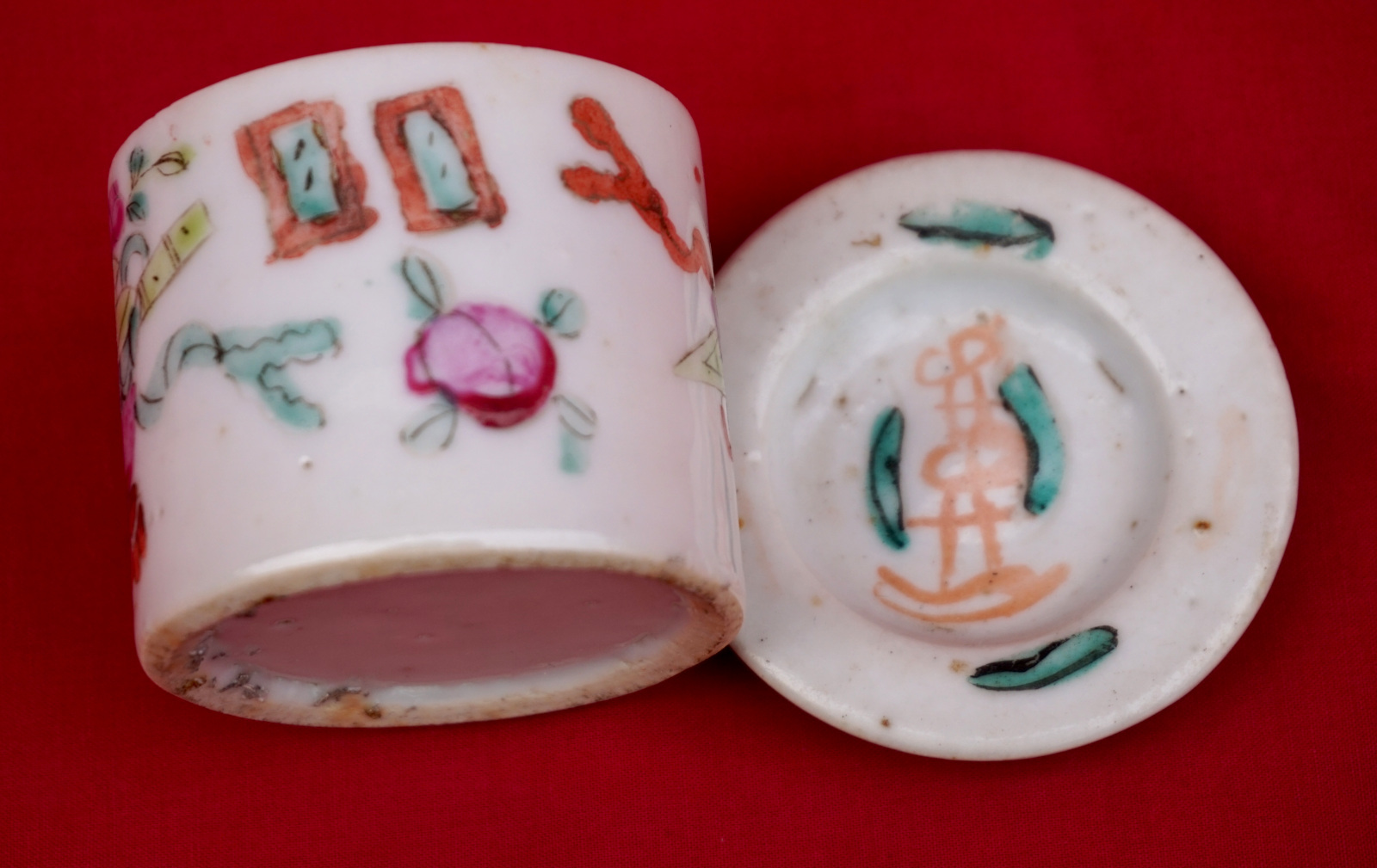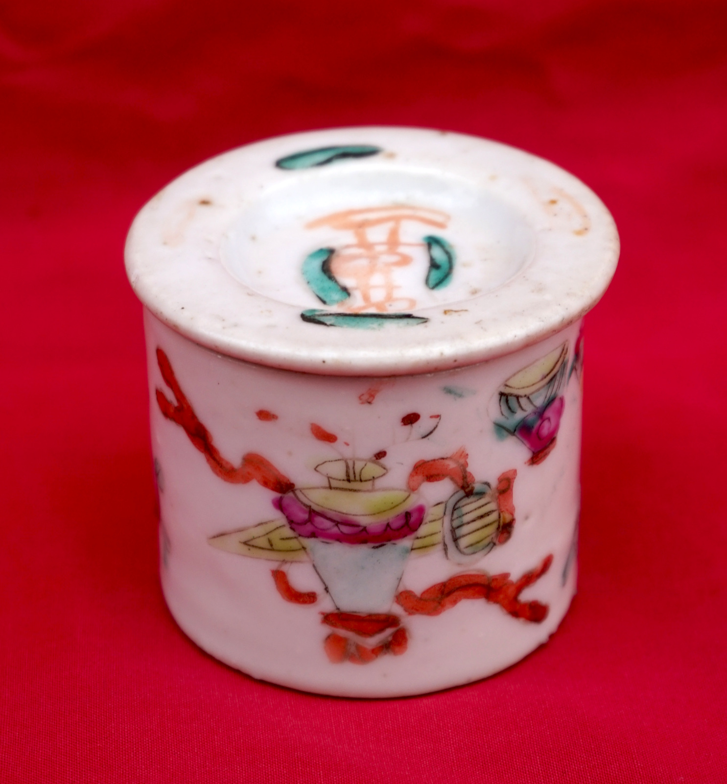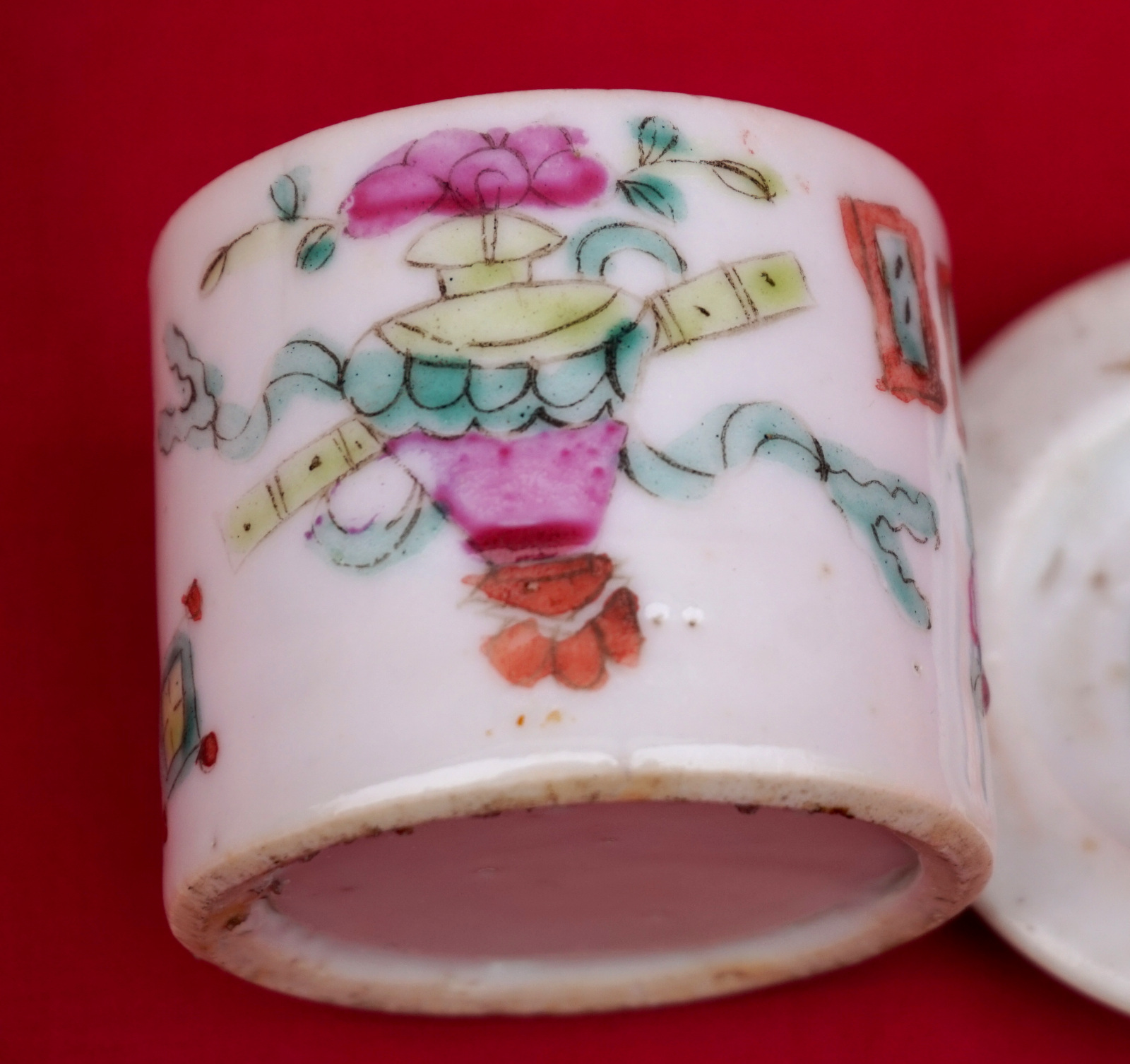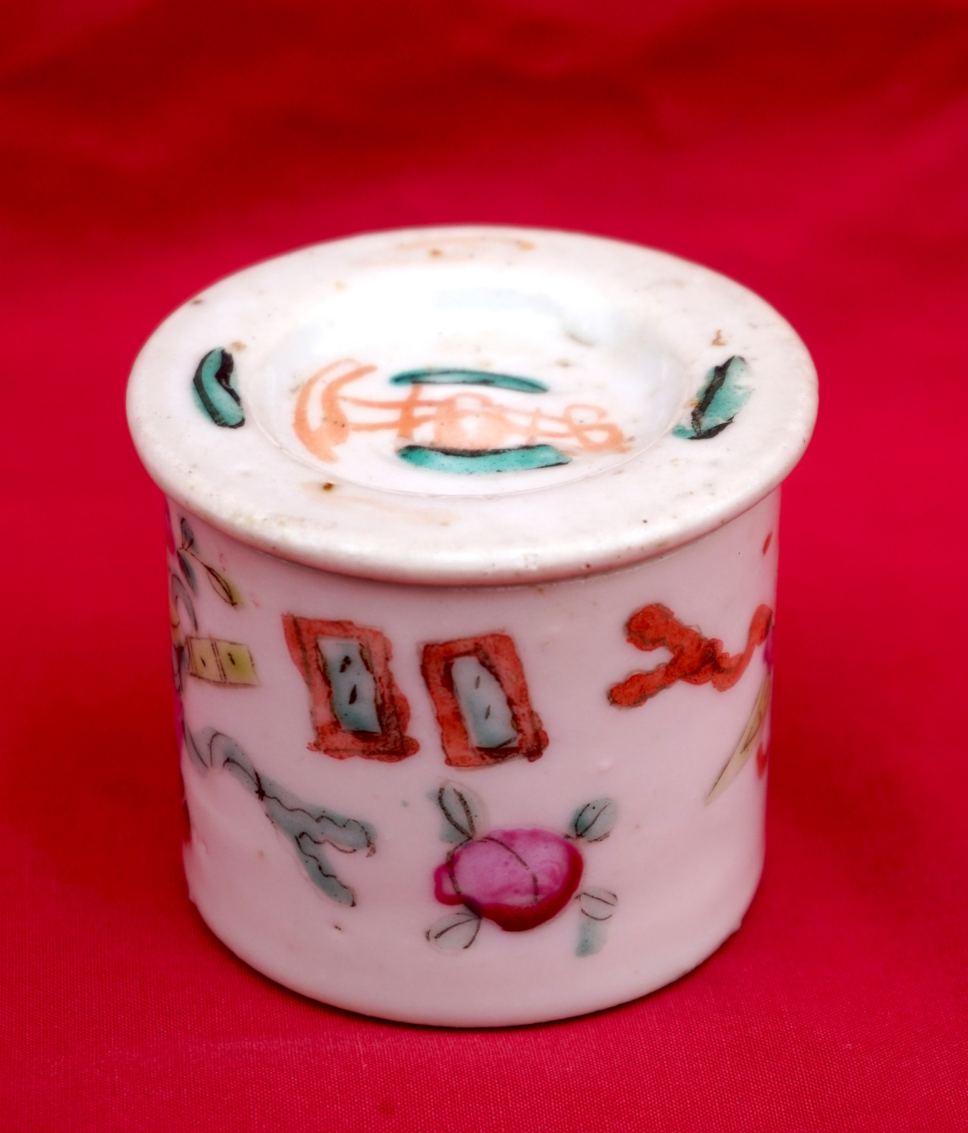 Boite à fard en porcelaine chinoise réhaussé de décor peints mains, vers 1900. Hauteur 4.5 cm, diamètre 5.5 cm. Parfait état.