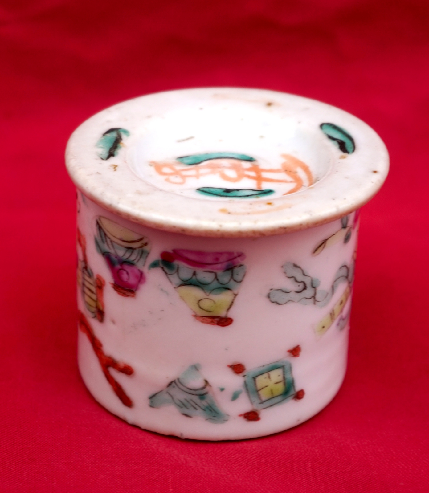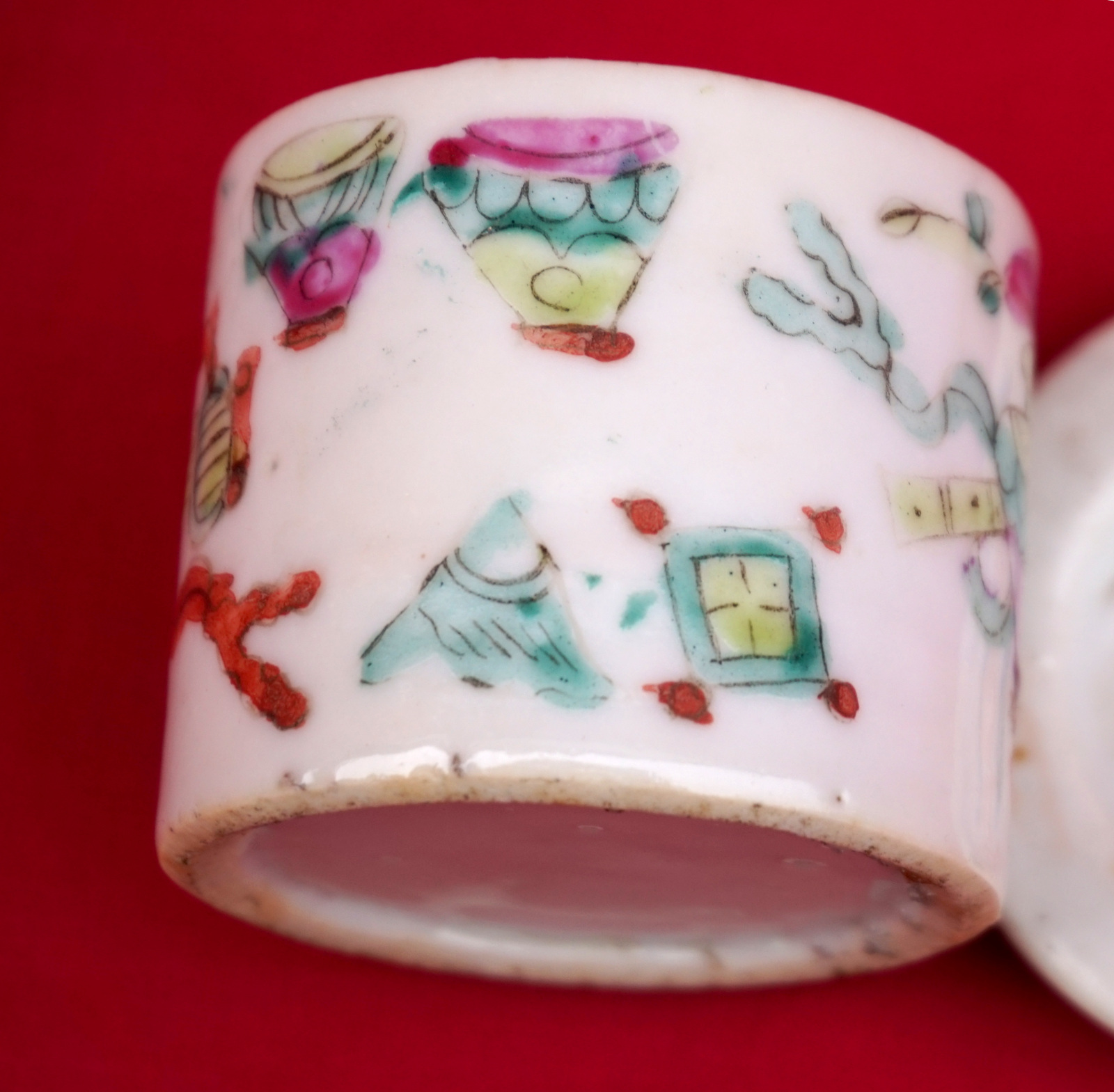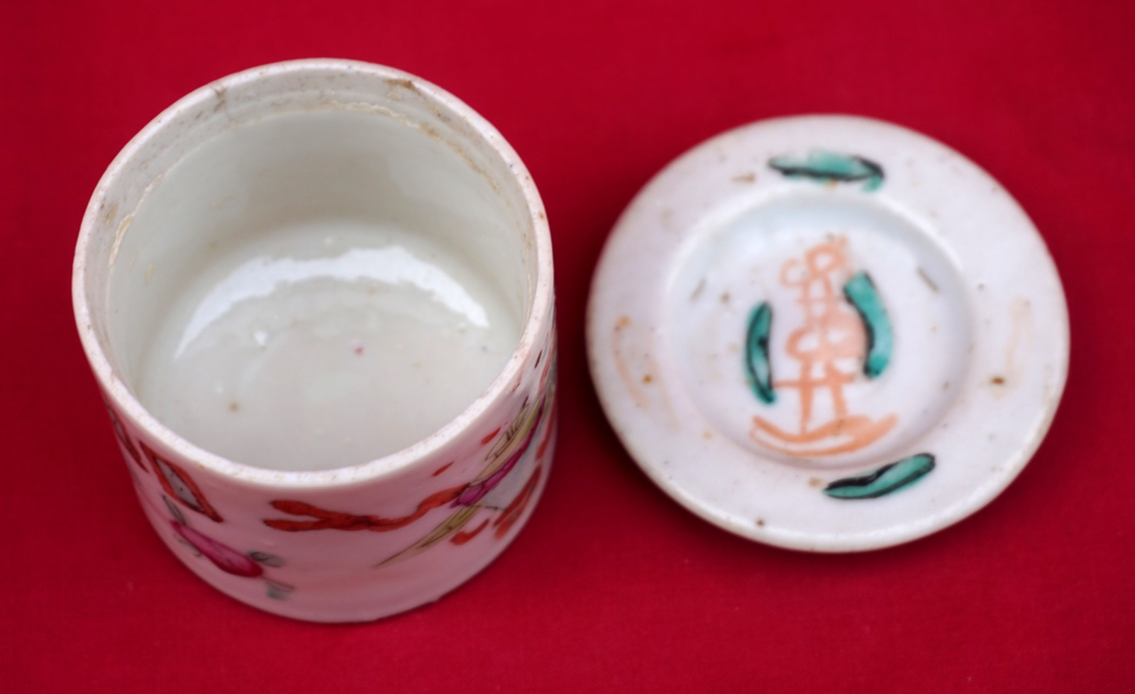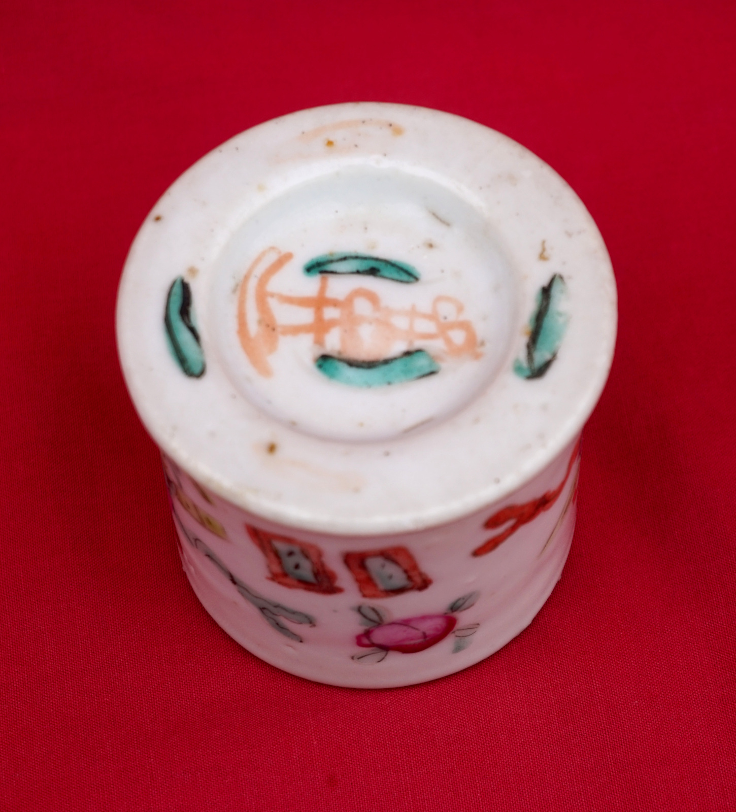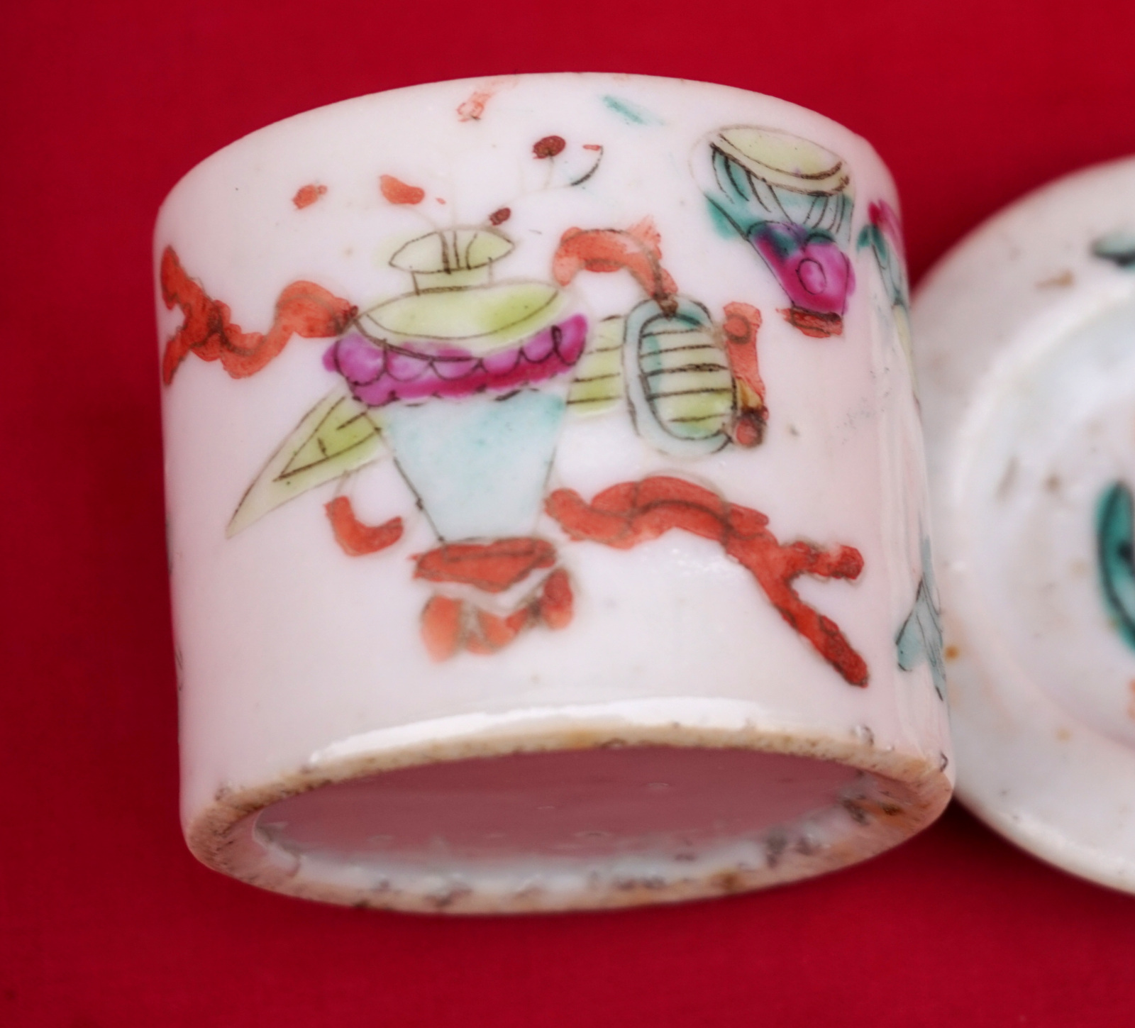 Boite à fard en porcelaine chinoise réhaussé de décor peints mains, vers 1900. Hauteur 4.5 cm, diamètre 5.5 cm. Parfait état.