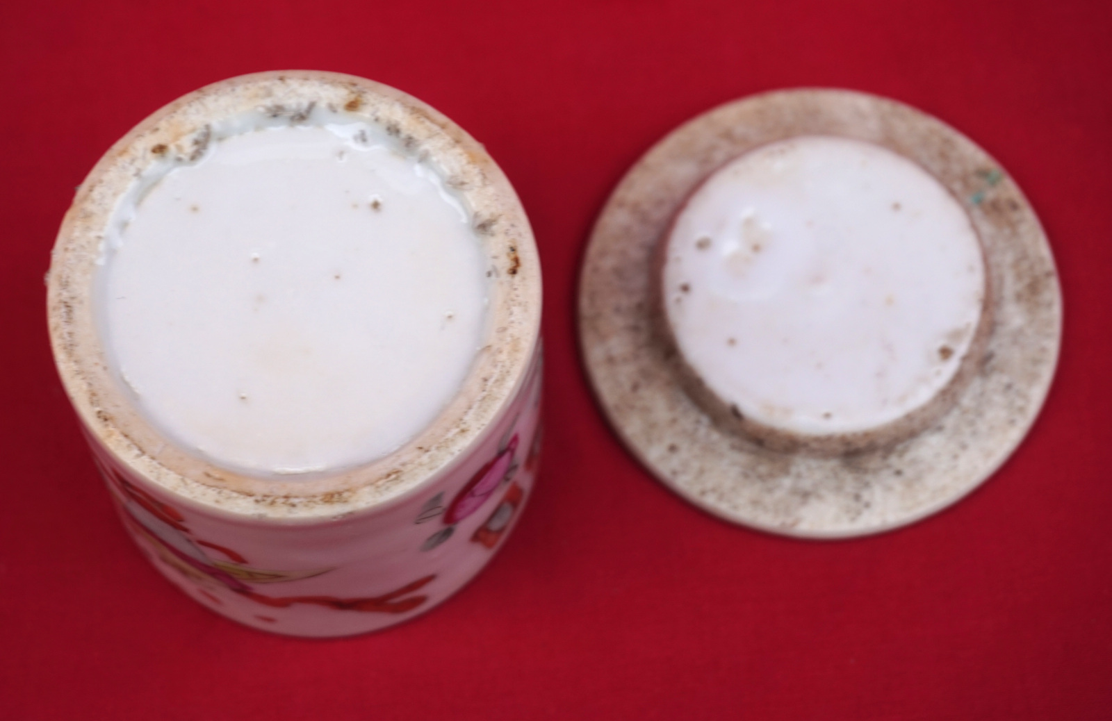 Chinese hand painted porcelain cosmetics, powder or makeup box made during the 1900's. 2 1/8" (5.5cm) diameter, 1 3/4" (4.5cm) height. Perfect condition.