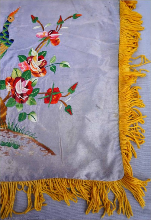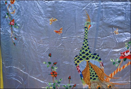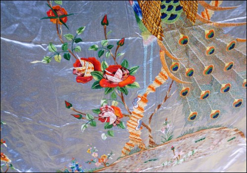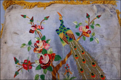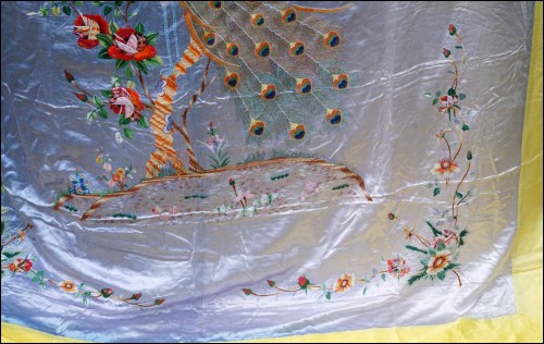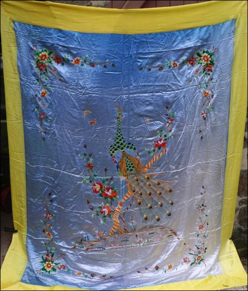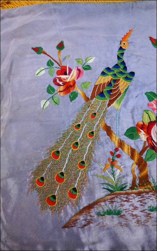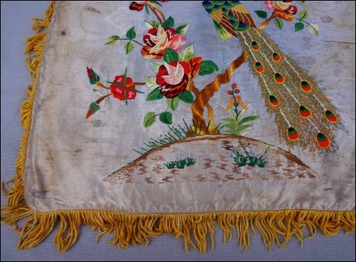 Chinese Large Embroidered Silk Panel 81" w 2 Cushions Peacock