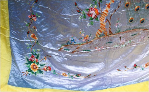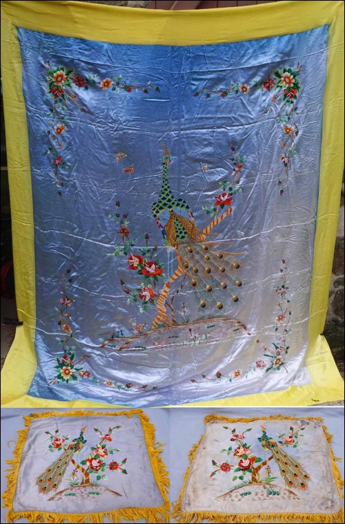 Grand panneau et ses 2 coussins en soie brodée à décor de paons et de fleurs, Chine début XX° siècle. Dimensions pour le panneau sans le cadre en soie jaune 206 cm par 170 cm, pour les coussins sans les franges 46 cm par 40 cm. Bel état quelques usures sur le fond en soie bleu azur.