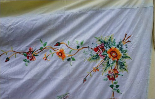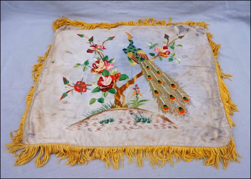 Large chinese silk panel with 2 cushions showing peacock, flowers and roses made in Chine early 20th century. They measure: for the panel without the yellow silk frame 81" (206cm) by 67" (170cm), for the cushion 18" (46cm) by 15 3/4" (41cm) Good condition only a small used on the blue silk background for the panel and used and stains on the blue silk background for the cushions as shown by the following pictures.