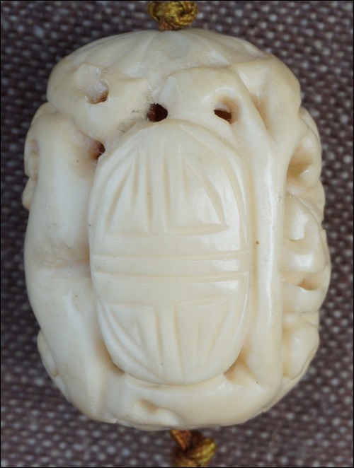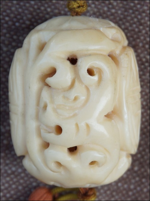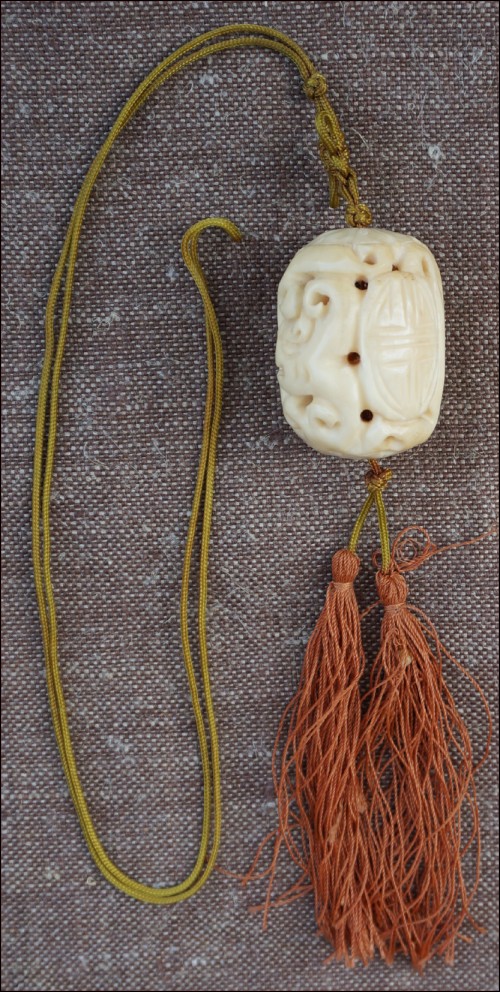 Pendentif chinois, offert pour les fêtes du Nouvel An, en forme de grosse olive en ivoire ajourée, sculpté de deux têtes de dragon et symbole, vers 1960. Il est monté en collier sur un cordon de soie au noeux chinois terminé par deux pompons. Longueur 51 cm, pour la boule : hauteur 4 cm, diamètre 3 cm.