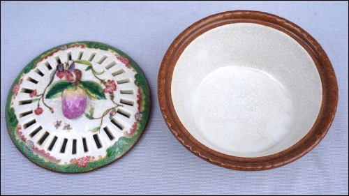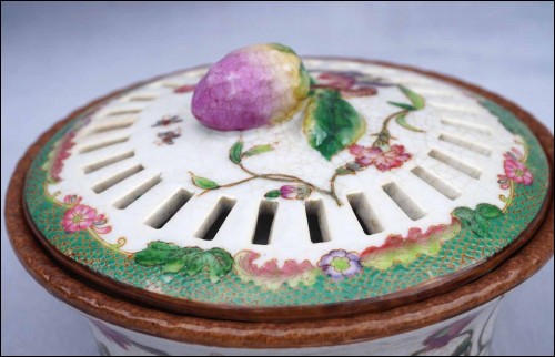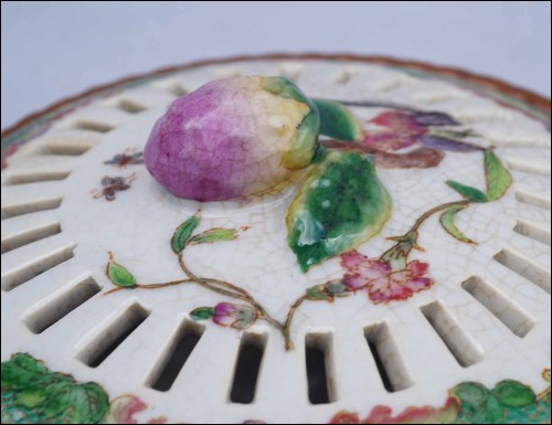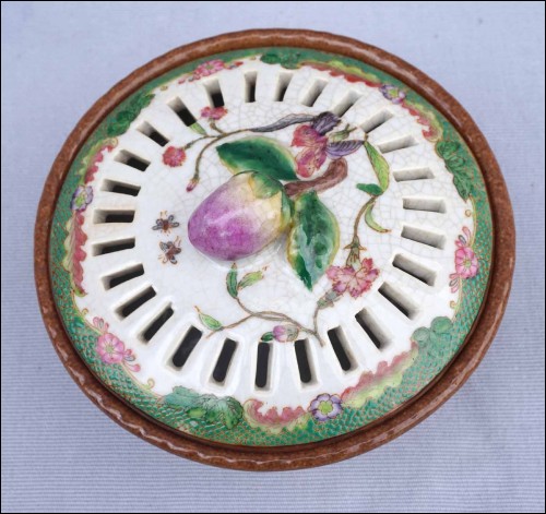 Vintage Chinese hand painted porcelain scent potpourri box with pierced lid made by Wong Lee during the 1980's. It's signed on the back. 5 1/8" (13cm) diameter, 3" (7.5cm) height. Perfect condition as shown by the following pictures.