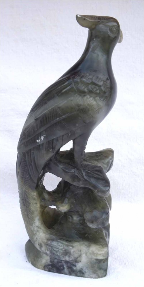 Antique serpentine stone hand carved statue showing a Phoenix on a branch made during the end of the Qing dynasty in China. Good condition only a few small impacts due to its great age. 7 7/8" high 3" width.
